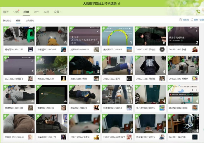 受疫情影响,学校停止了线下的体育活动。但体育运动不局限与时间地点,因此大数据与计算机科学学院体育协会开展了此次活动。本次打卡活动主要依托QQ群这一新媒体平台,而参与打卡的主要方式是:参与活动的同学自行下载运动应用软件,自由选择健身课程,通过照片、视频、运动app截图等方式在QQ群进行每日打卡,同时同学们还可以在群里交流运动心得,分享健康运动方式,同学之间互相监督、互相鼓励,增强了每日运动的主动性和积极性。期间,工作人员只需定期核对同学们的打卡信息。