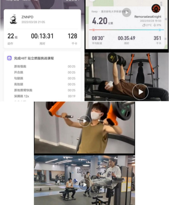 本次线上体质锻炼打卡活动的内容涵盖了腰腹力量的锻炼、上下肢爆发力的强化和柔韧性的加强等,在跑道上的挥汗淋漓、一俯一卧的力量等运动方式纷纷上线,不仅形式丰富多样,令人耳目一新,而且也培养了同学们健康规律的生活习惯,领略到“自律”与“坚持”的魅力。在尝试不同运动的同时,既保证了锻炼动作的正确标准,又做到了量力而行,避免造成身体劳损,契合了“在寝室也能锻炼”的活动初衷。