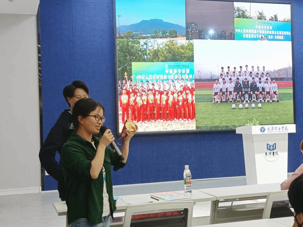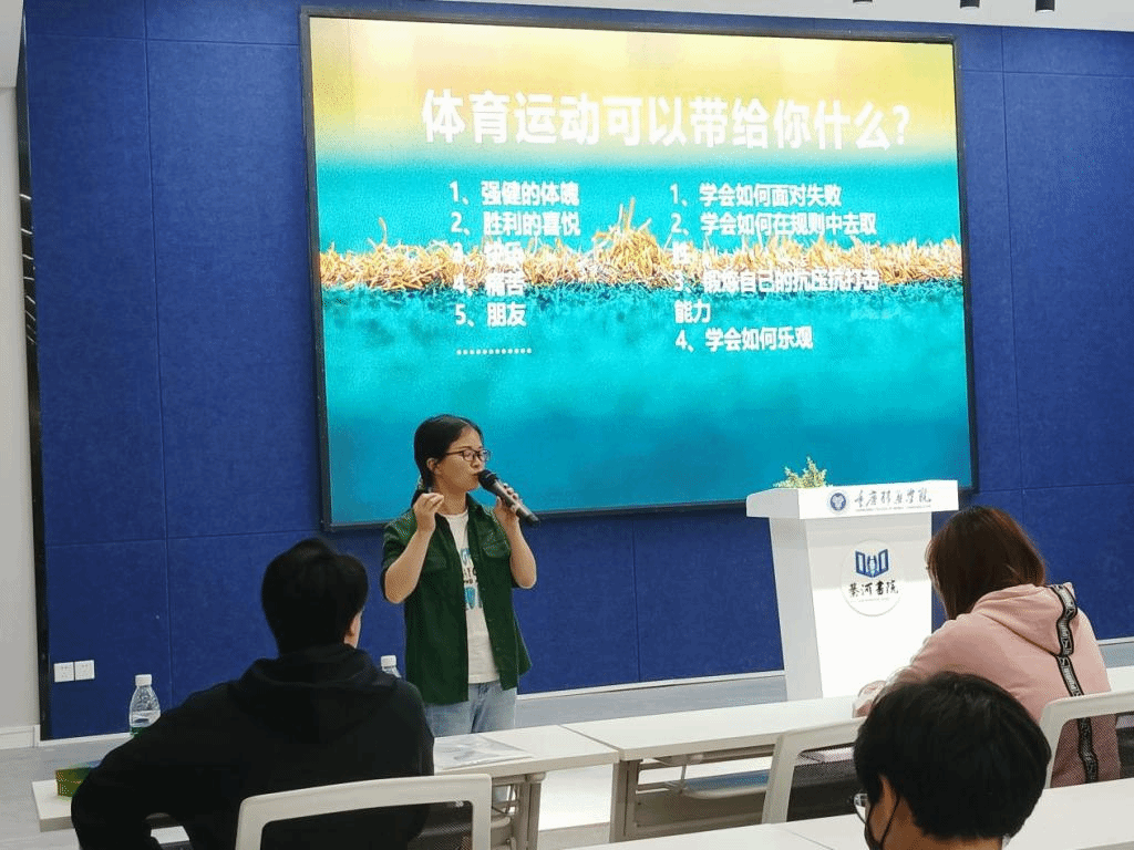 “体育可以为你带来什么?他给我带来了各种身份,国家一级运动员、足球教练、全运会冠军。”曹老师用自问自答的方式讲出来自己的身份。从这些身份也可以知道体育在曹老师的一生中占据了绝大多数的时间。借此她从她的体育学习、锻炼、比赛、教学等多方面的经历,为同学们讲述她的体育之路。她强调“体育是一个非常有魅力的一门课程,能够给同学们带来快乐,让同学们对生活,对学习保持一种积极向上的乐观态度。”
