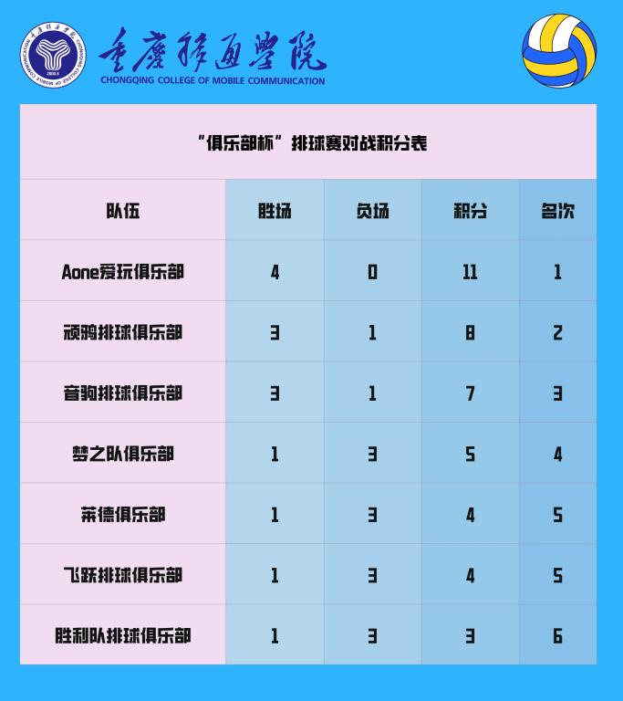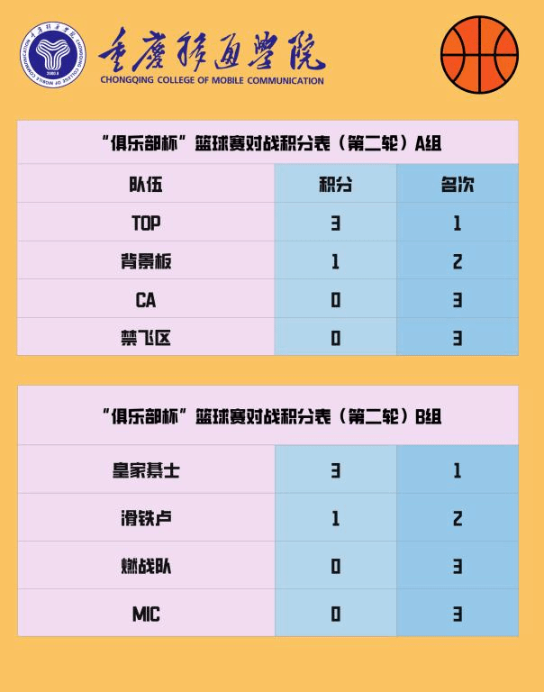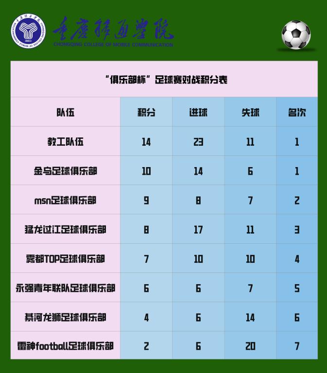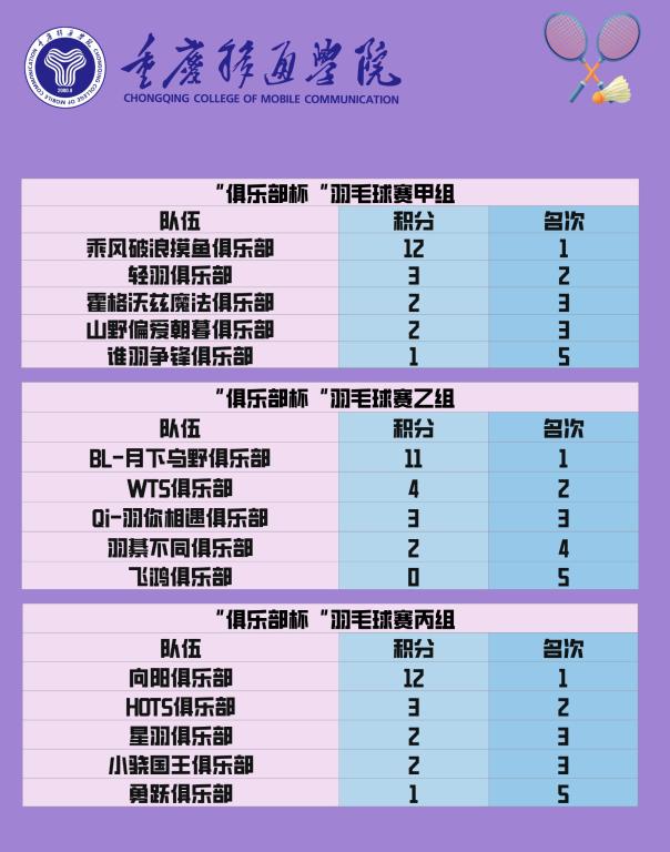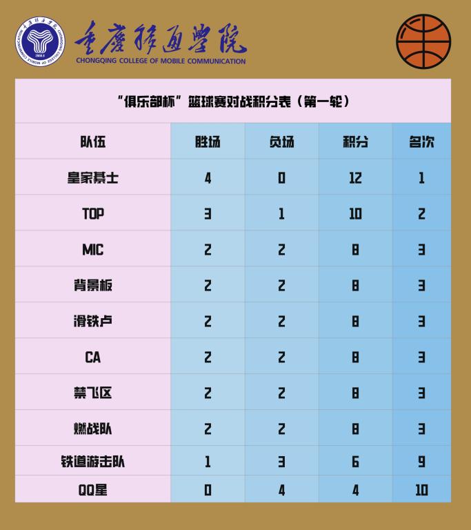 篮球足球排球三大项目通过上个学期的激烈较量,首轮比赛即将全部结束。这学期羽毛球和乒乓球两个小球项目的俱乐部赛事也开始启动。其中篮球率先进入第二轮小组淘汰赛,在第二轮比赛的首个比赛日中背景板战队不敌TOP战队,皇家綦士战队战胜滑铁卢战队。足球比赛仍差两个比赛日完成第一轮的对抗,排球同样需要几个比赛日来结束第一轮。4月1日两场比赛因天气原因继续延期,后续打完最后两场比赛,羽毛球俱乐部赛事活动将进入了决赛圈环节。以下是截至目前的比赛积分表。