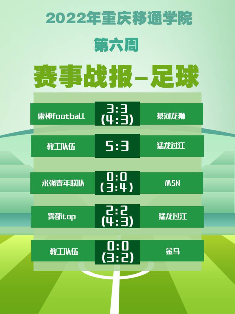 因疫情的影响,本来应该正常进行的俱乐部杯比赛为此推迟了进两周的时间,终于在第六周时继续举行。乒乓球与足球率先开展了一系列比赛,篮球、排球、羽毛球由于天气原因开展比赛进程缓慢。其中足球比赛在阴雨绵绵的天气中进行,下雨天也阻挡不了各个俱乐部的队员在绿茵场上角逐的热情。重庆移通学院綦江校区首届足球赛教工队也与同学们一起进行比赛,比赛过程相当精彩,三场比赛均战至以点球结束比赛。