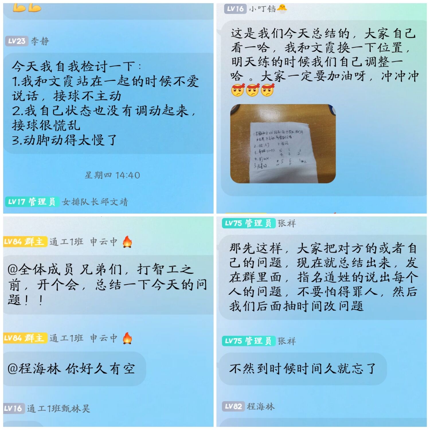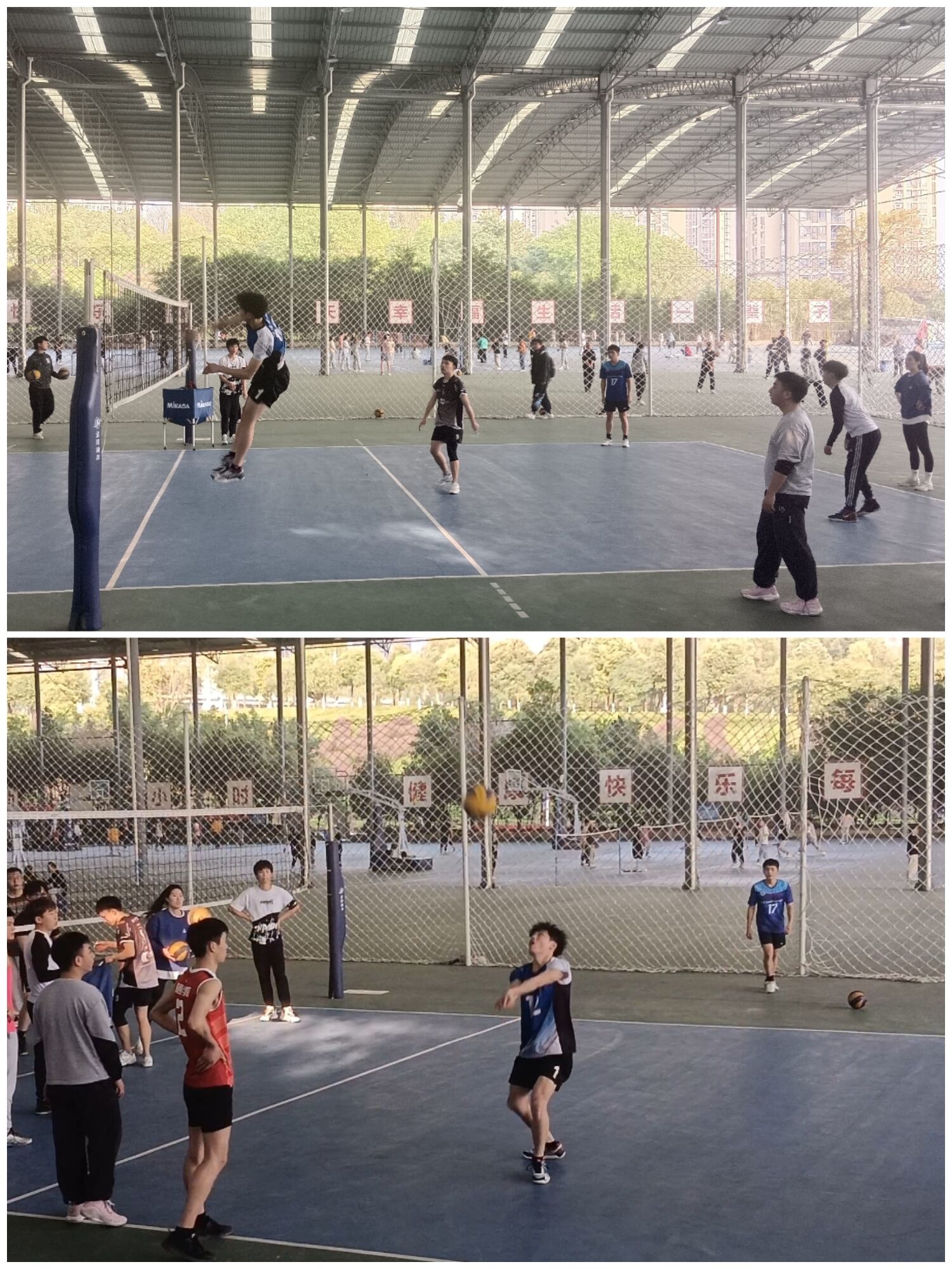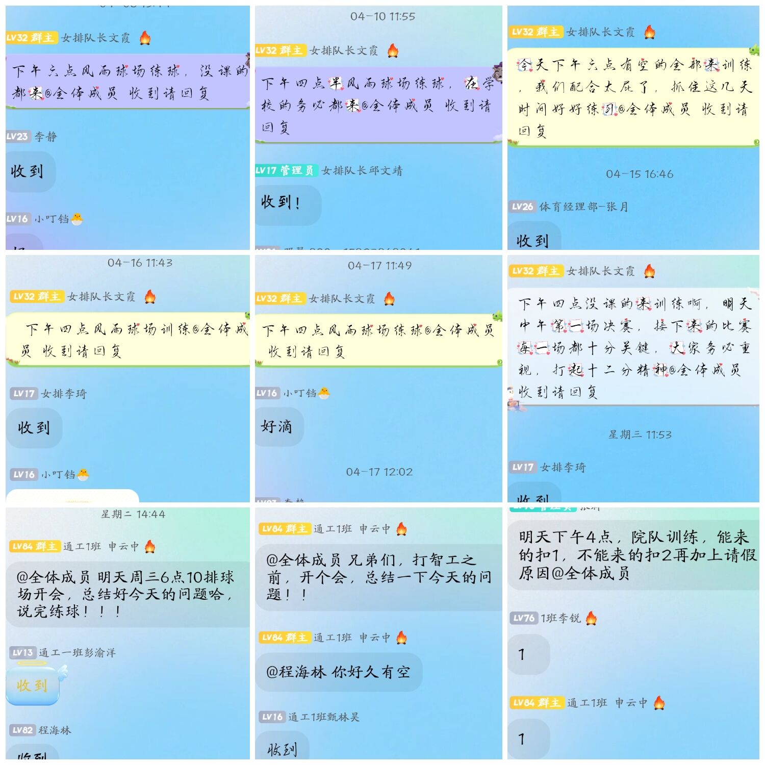 为备战比赛,除了规定的训练时间,队长们还自发的组织训练,有时周末大家也都在认真加练,比赛前,男排队长申云中坦言:“尽管只有三成的把握拿冠军,但我们也不能放弃,努力防守,为了冠军,拼了!”女排队长文霞说:“今年我们的目标是保二争一,我们尽力拿出最好的状态去迎战!”为了在比赛中做到零失误,男排女排在周末一起打友谊赛,相互指出双方队伍中存在的问题和可以避免的失误。充分发扬坚持不懈,不达目的不放弃的精神。腰酸背痛、淤青摔伤在此刻更像是熠熠发光的勋章。