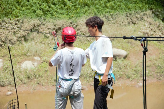 横渡系统,在一端固定完成后,最重要的就是架设灵活高效的紧绳系统,在救援现场经常出现,用于现场转移不能移动的伤员,锚点灵活多样。为测试队员搭建系统的稳定程度,当你拉着扁带冲下坡坎的一瞬间你就会体会到肾上腺素的飙升,担心掉进水里?在几秒钟到达彼岸后发现都是不存在,这些体验强大了人的内心。看似困难实则简单的横渡系统最重要的是克服心理障碍,挑战自我是胜利!