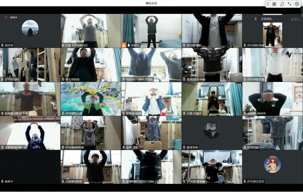 停课不停学,运动不停歇。竞技体育中心在疫情防控线授课期间,充分发挥体育项目的多样性,困中求变,创新性的提出八段锦、瑜伽项目合班教学,既保证了教学效果的同质同效性,又满足了封控期间同学们的锻炼需求,还进一步扩充了志愿者队伍。