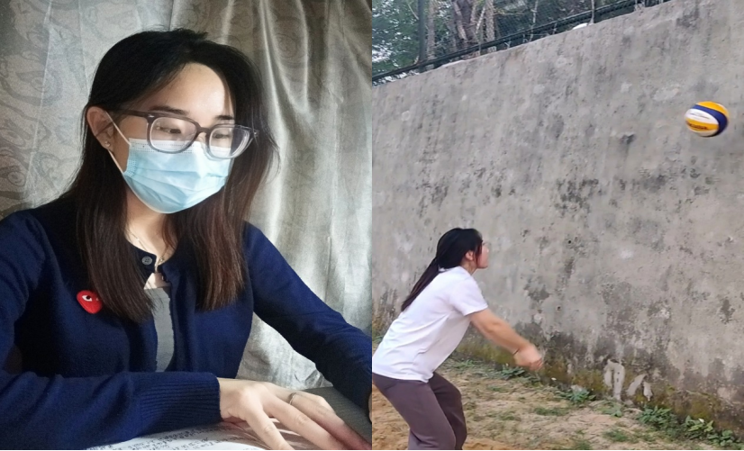 我目前担任本专业年级长和校女排队长,学习之余,需要完成常规的疫情工作并做好带头作用。除此之外,疫情的到来也并没有耽误我的排球训练,每晚六点,教练会带着我们一起做体能运动,如平板支撑、俯卧撑 、深蹲起、跳绳……让我们在居“家”隔离的同时也保持身体的健康。