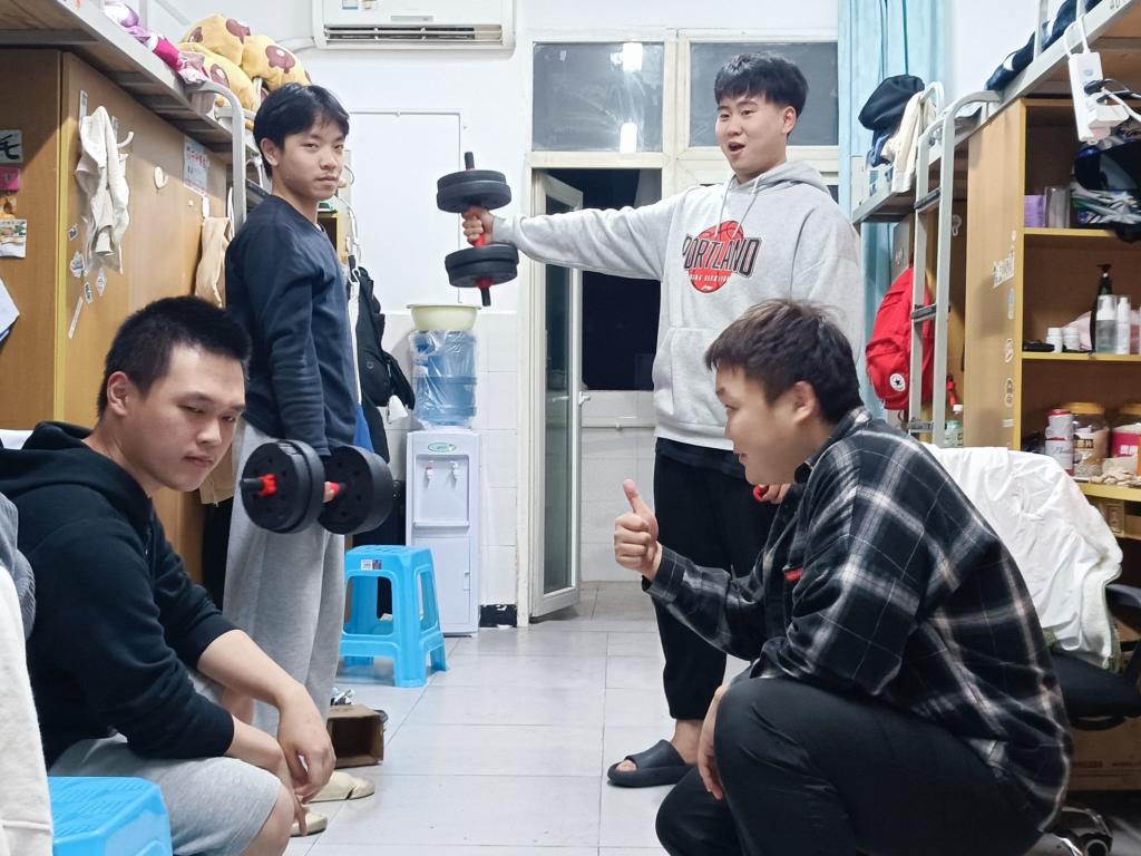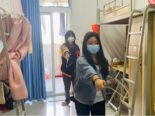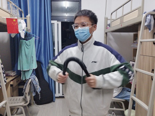 同学们发挥奇思妙想,在有限的空间里寻找可以运动的机会。各式气功层出不穷,各种武功招式让人眼花缭乱,此时同学们已然变身成为一个个武林高手、气功大师。你看,那边的同学正以衣架为剑,眼神坚毅,不断做出刺剑,劈剑的动作,仿若一个个正身处战场的大侠一般;再看,这边的同学早已开始打起了太极拳,一个个坚实的马步,稳中求准,一个个轻慢的动作,柔中带刚,一个个专注的眼神,屏息凝神。虽然只能宅在寝室里,但同学们依然用着各种充满创造力的方式,向外界展现出淬炼学子的青春活力。