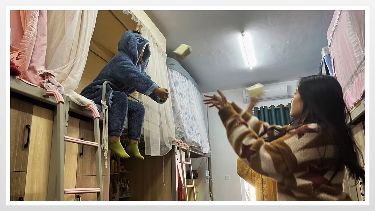“趣味投篮赛”规则如下:一人扮球筐,小腿部分露出床的围栏外,上身直立,胳膊呈环绕的圆圈状,十指交叉;其余的人参与拍摄或投篮。投篮者可投任娃娃、抽纸、零食等任意物品(管制刀具、坚硬边角和尖锐的物品除外)。