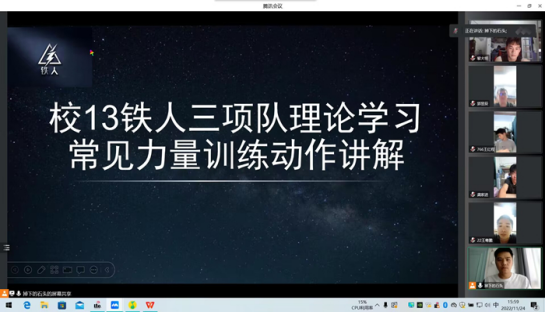 11月23日校13铁人三项队在腾讯会议进行“常见力量训练动作讲解”的理论学习。李游教练分别对平常的核心训练和腿部专项训练动作进行了详细的讲解,并指出队员们在训练时的错误动作,有效的达到了学习的预期目标。