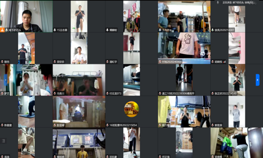 11月,突来疫情使训练方式转为线上开展。前期训练内容以安抚队员情绪调整队员心态为主配合简单的心肺训练为辅,后期训练内容主要以有氧操,腰腹训练以及小力量训练为主,同时利用同屏互动加强与新生之间的沟通。