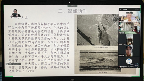 11月18日女游于腾讯会议APP开展线上理论学习。本次理论课主要了解并学习自由泳手部以及与呼吸之间的配合技术动作。通过播放PPT、教学视频以及示范讲解,加深新队员对自由泳手部技术动作与呼吸之间配合的理解和感受。