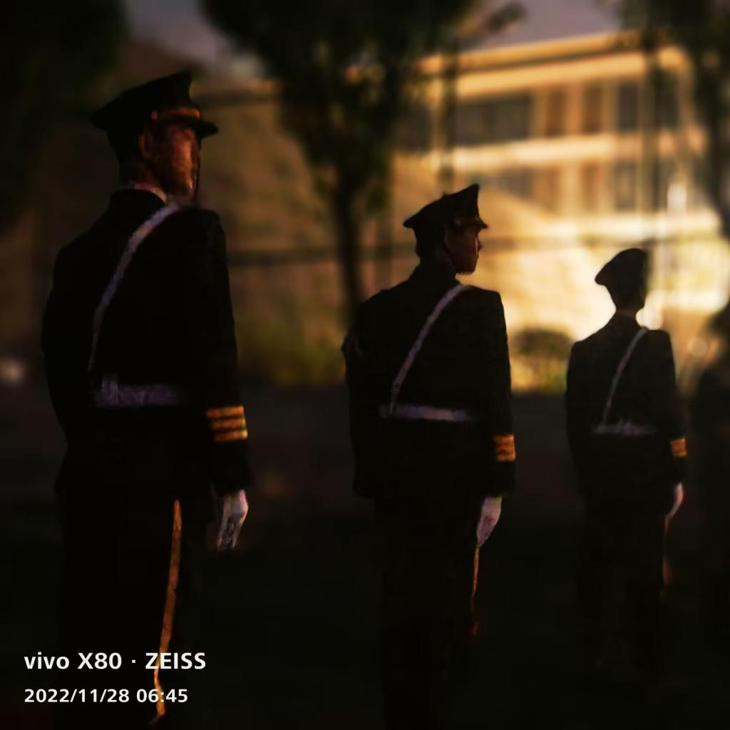 除了升国旗外,国旗班还需要进行日常训练。卓越始于点滴,11月里,他们一共训练了39次、78个小时、4680分钟……有早上日出的陪伴,看着朝阳和希望冉冉升起;有傍晚朝霞的守护,日月同辉,一起见证国旗班的量变到质变……“一、二、三、四”清晨,他们用嘹亮的口号唤醒了沉睡的移通,大家还在睡觉的时候,他们已经大汗淋漓的出完了早操。“立正、稍息”利用大家晚餐时间晚训,挺拔如青松的军姿就是他们对国旗的承诺。汗水挂在他们的脸上,星月披在他们的身上,即便天气骤冷,但是训练强度依旧未曾减弱半分。要达到标准需要日复一日、年复一年的努力,让肌肉产生记忆,让精神得到磨练。因为国旗班的任务是神圣光荣的,升旗仪式更是神圣庄严的,所以国旗班要用他们坚定的意志保证完成每一次任务。