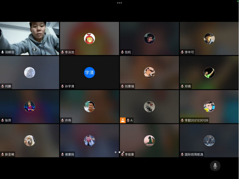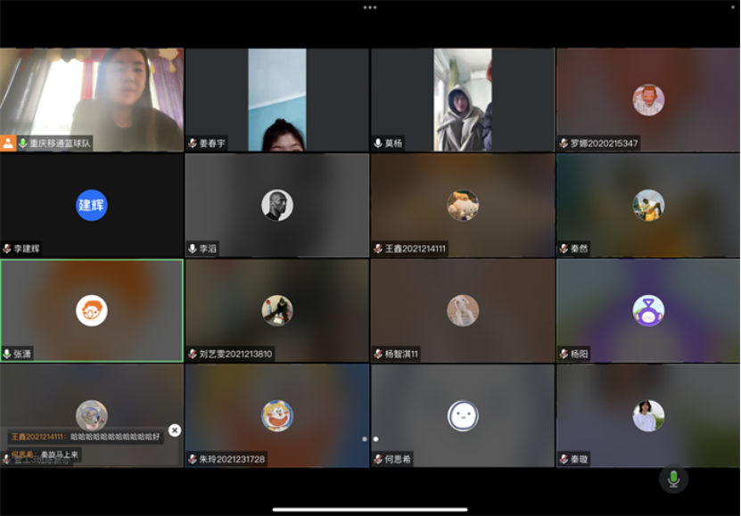 团建活动:12月16日,校男篮通过线上会议的方式进行了以学期总结为主题的团建活动。会议中杨典教练先总结本学期因疫情原因导致本学期的大学生比赛延期以及后半学期的训练都以线上训练的方式开展,同时对下学期的训练提出要求,希望队员们能调整心态,继续努力。最后队员们也各自发言总结了本学期自身的训练,并对下学期的训练制定自身目标。