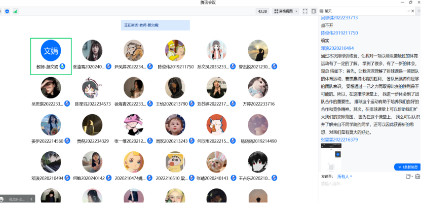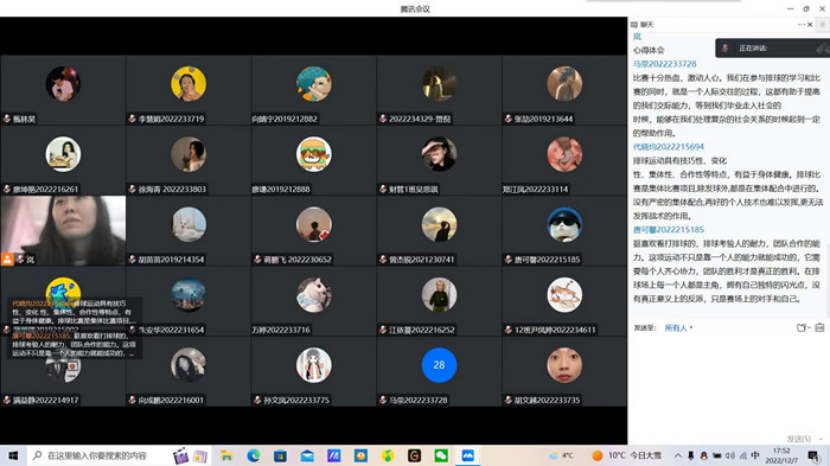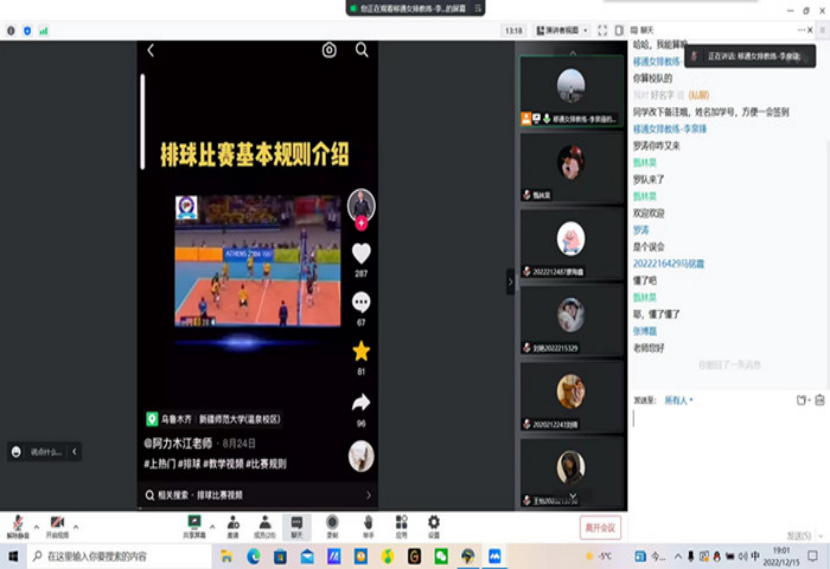 任选课:本月任选课改为线上对教学有较大难度,学生普遍反映集体生活不方便开摄像头和语音会影响宿舍其他同学,所以互动跟学生互动较为困难,主要以观看排球相关视频让学生对排球项目进行了解。