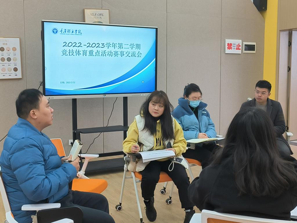 插上“活动”的翅膀,扬起青春的风帆。竞技体育中心为促进学生的全面发展,顺利展开各项竞技体育活动,2月22日下午,江华主任、白可聪老师、刘莎莎老师联合各学院体育辅导员和体协负责人在瀛溪书院形而上思辨空间召开了“合作推进2022-2023年下半学期竞技体育赛事活动”交流会,会议由江华主任主持。