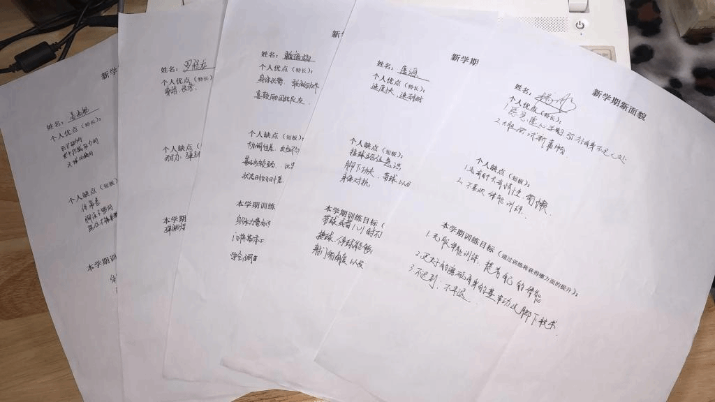 从踏入校门的那一刻起我们就知道,新学期开始了。新,就是开变;新,就是进取;新,就是创新。所以,在新学期中,我们要不断求新,求进步,求发展。而新的目标就是新的发展的基础。那么,在新的学期里足球队的队员们该树立什么样的目标呢?两位教练给大家下发了一张“新学期新面貌”,大家自我巩固,写上个人的优缺点及本学期的训练目标。有了目标就要为之付出努力,望大家共勉。