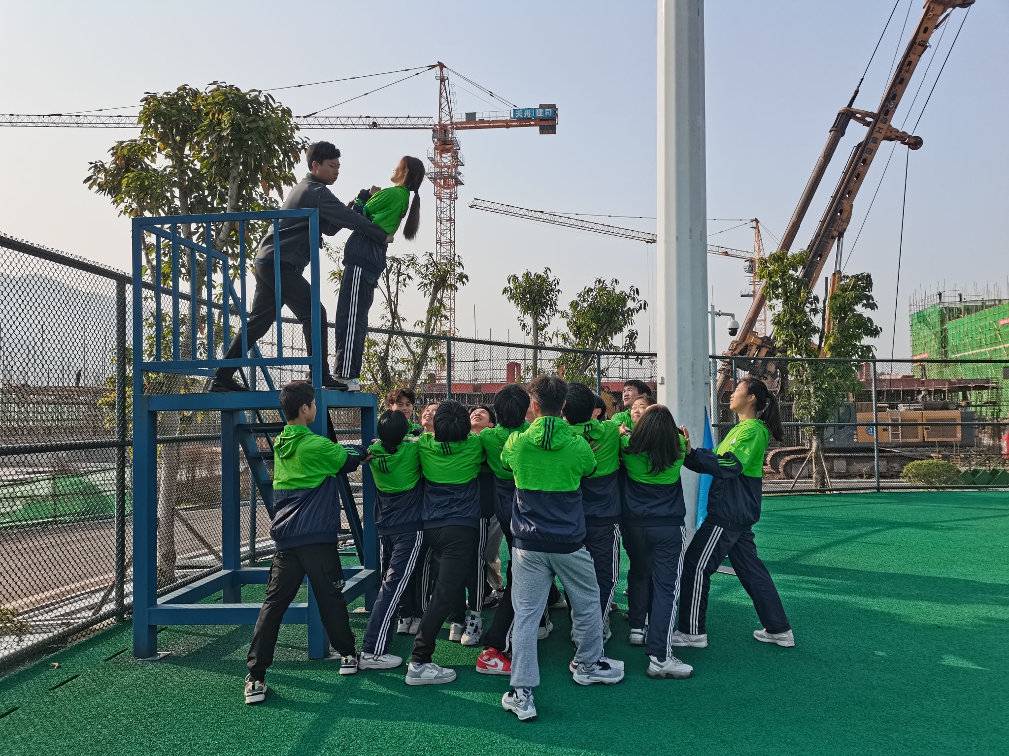 信任是人与人之间交往的基础。第二天各个小队在教练的带领下,分别进行一天的营地拓展训练。“信任背摔”:一名队员需在1.6米的高台上背对直躺向由其他队员搭成的“人桥”摔去。台下的队员们精神集中、齐心协力为台上队员搭好坚固、安全的人桥,台上队员克服恐惧、相信队友向后倒。队员们之间的相互信任,是完成背摔的关键所在,遇到困难时,队友和团队是我们坚强的后盾。“七巧板”:一个小队分为7组,队员们通过不断的沟通与交流,再由第七组队员传递任务书和拼图,大家集思广益、分工明确、有条不紊地完成拼图任务。队员们通力合作、各司其职、合理优化分配资源,才能将任务出色地完成。