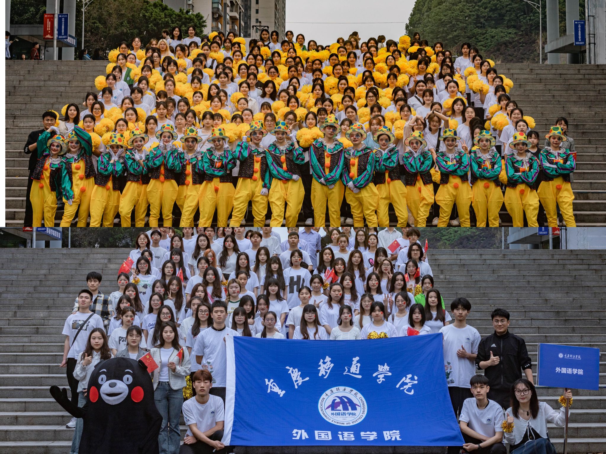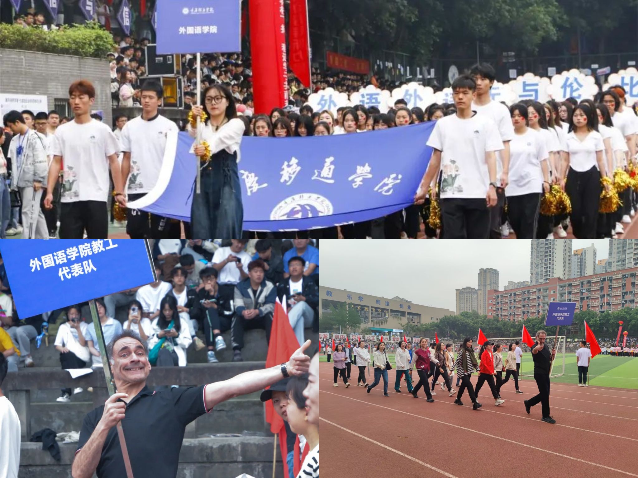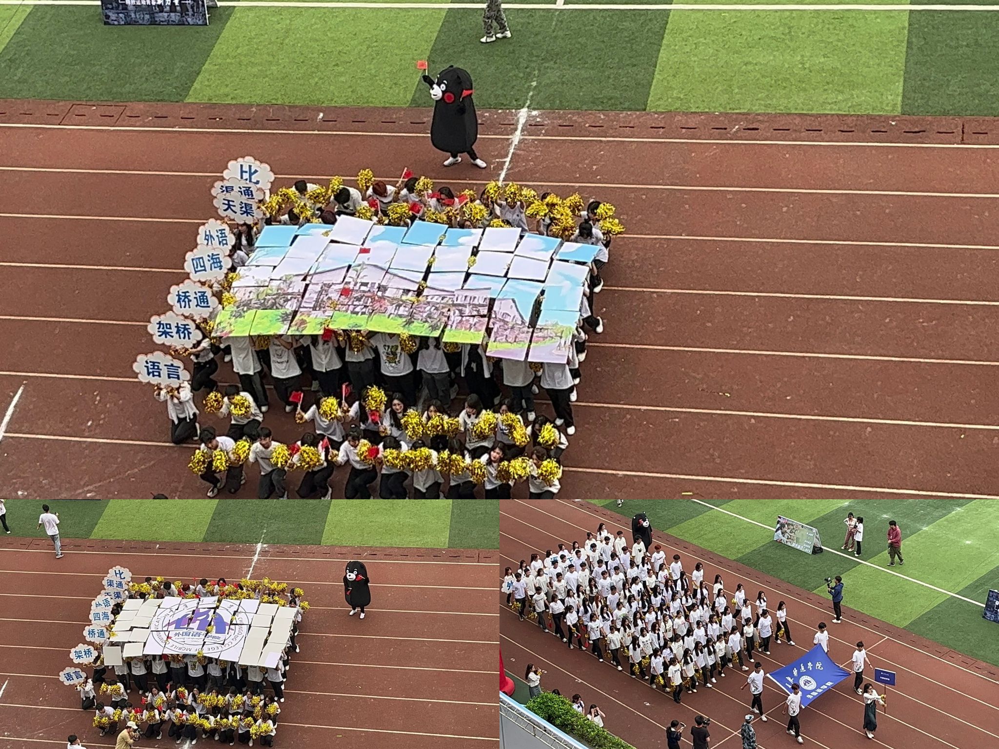 开幕式中,外国语学院方阵展现外院的特色以及外语学子的青春活力,“外语外语,无与伦比”外语学子用洪亮的声音喊出振奋人心的口号!几十号人的队伍迈着整齐的步伐,昂首挺胸。由外教Clive带领的外国语学院教工代表队热情的向全校师生打着招呼,外国语学院的整个队伍都显得活力满满!