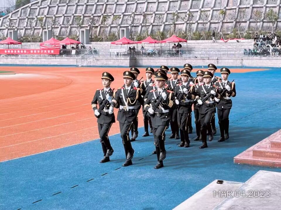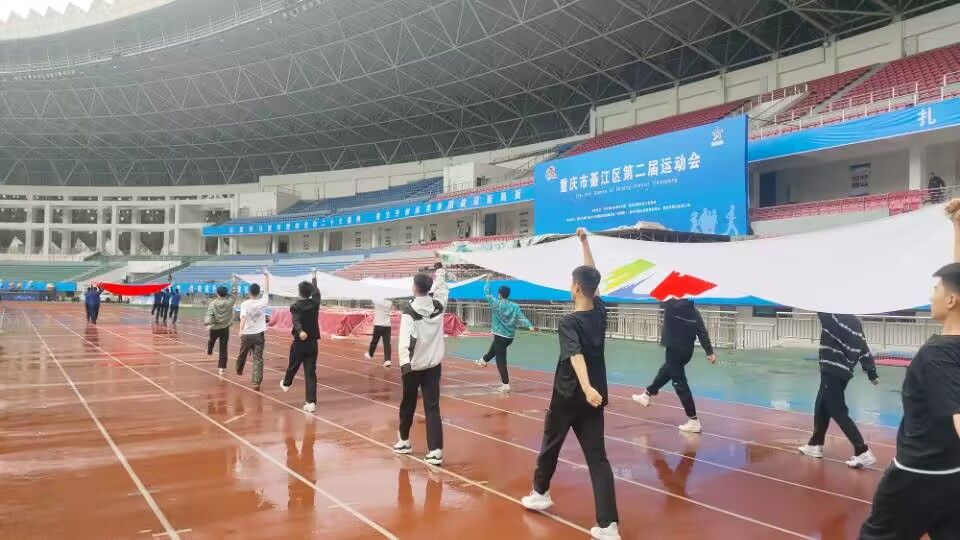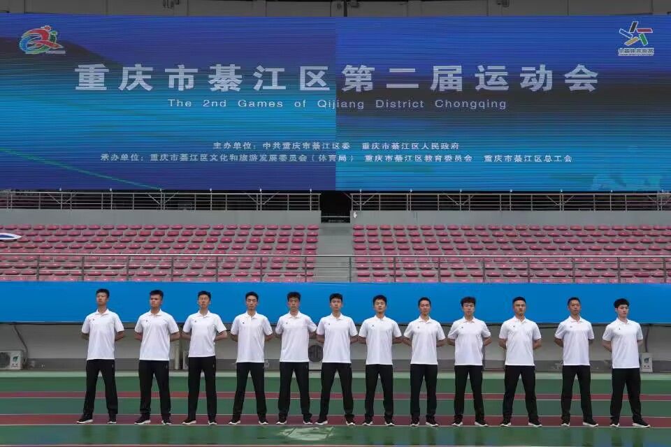 阳光正暖,微风不燥,4月14日上午九点,重庆市綦江区运动会正式开幕。伴随着激昂的音乐,在区体育馆10000余人的瞩目下,五星红旗领着参赛方阵入场,紧随的是我校12名国旗护卫队队员将区运会会旗、区第二届运动会会旗护送入场。会旗以白色为底色,取綦江字母“QJ”为主要元素,同时有机融入青山绿水、奔腾的綦江河,运动圣火、跑道、彩带等视觉元素,形象直观地表达出綦江的美好形象,体现出綦江城市的活力与动感。与大学生的蓬勃生机交相辉映,他们昂首挺胸,动作整齐划一,在行进间努力回忆着张桃教练和徐新智学长前些天对他们的嘱托,认真思考每一个细节。伴随着出旗的口令,摆臂、行走、正步、举旗……第一项任务结束;伴随着高昂的会歌,挂旗、甩旗、升旗……第二项任务结束……每一个动作都一丝不苟、规范协调。