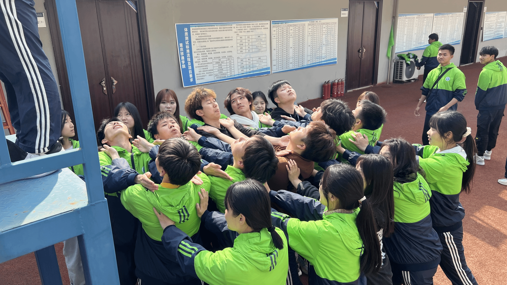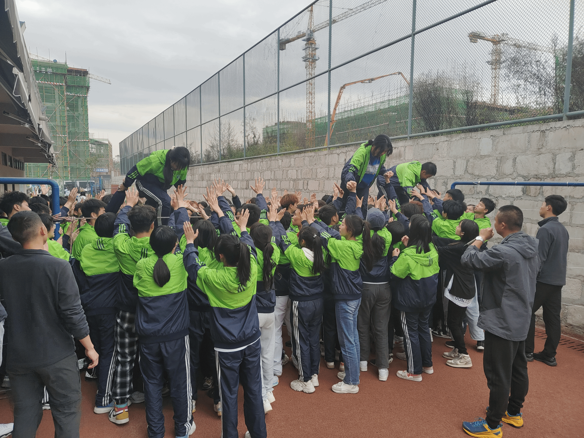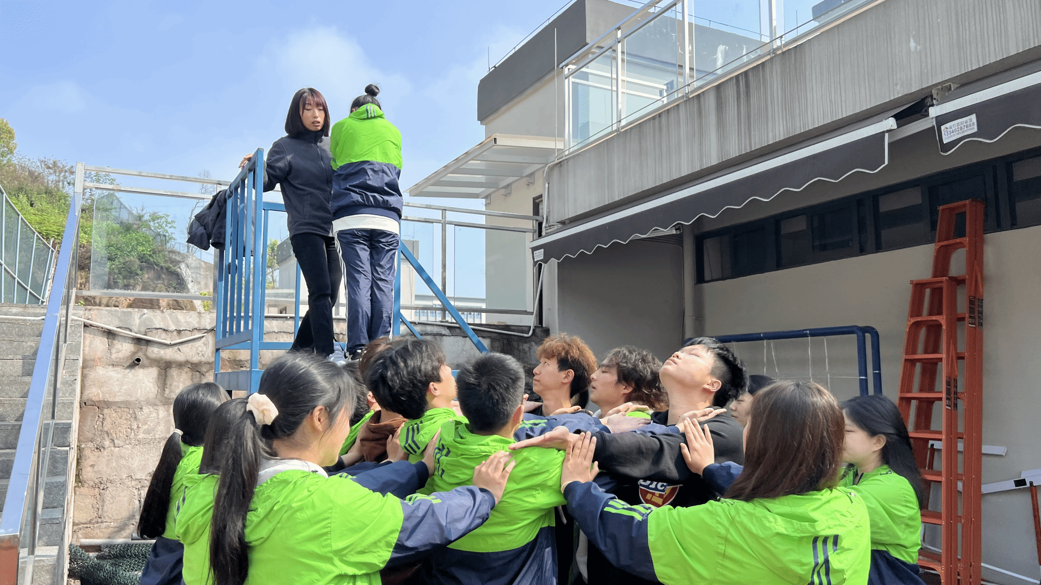 作为营地训练最后一个团体型项目——越障,同时也是重量级项目之一。在不能借助任何外力条件下,跨过1.60米高的长绳唯一的办法就是搭建人梯,而此时此刻同学们唯一的防护便是队友的肩膀与双手。人墙在坚持,断后人员在坚持,接力人员在坚持,已经成功翻越的人员在呐喊助威……在这个过程中,充分体现出了远景大家庭的概念,同时也加强所有人之间的羁绊与信任。