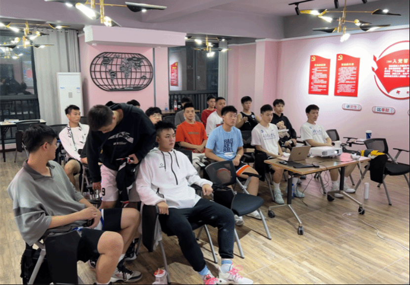 理论学习:本月校男篮在爱莲书院观看本队2023年重庆市大学生篮球比赛的录像回放。通过观看校男篮对阵重庆大学的比赛录像,教练将场上出现的过度紧张、技术动作运用不合理、轻视对手等问题一一作出了剖析,并且结合运动员心理方面的因素,进一步为队员们将紧张这一问题做出更为细节的说明。