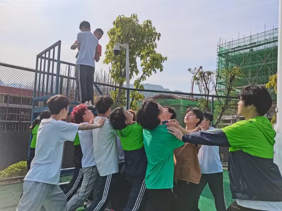 第一个团队项目——雷阵,使同学们学会团结一心,学会取长补短与互相支持。在项目开展期间,因为容易反复触雷,让同学们懂得合理分工的重要性;因为“雷、阵”字的存在,让同学们懂得抛弃惯性思维,学会创新……同学们在不知不觉中获得感悟。在找到安全的路线后,仍然“存活的”队员原路返回带着“阵亡”的伙伴回到原点,这便是同伴之间的相互帮助,潜移默化的使队伍逐渐变成更加牢固的团队。