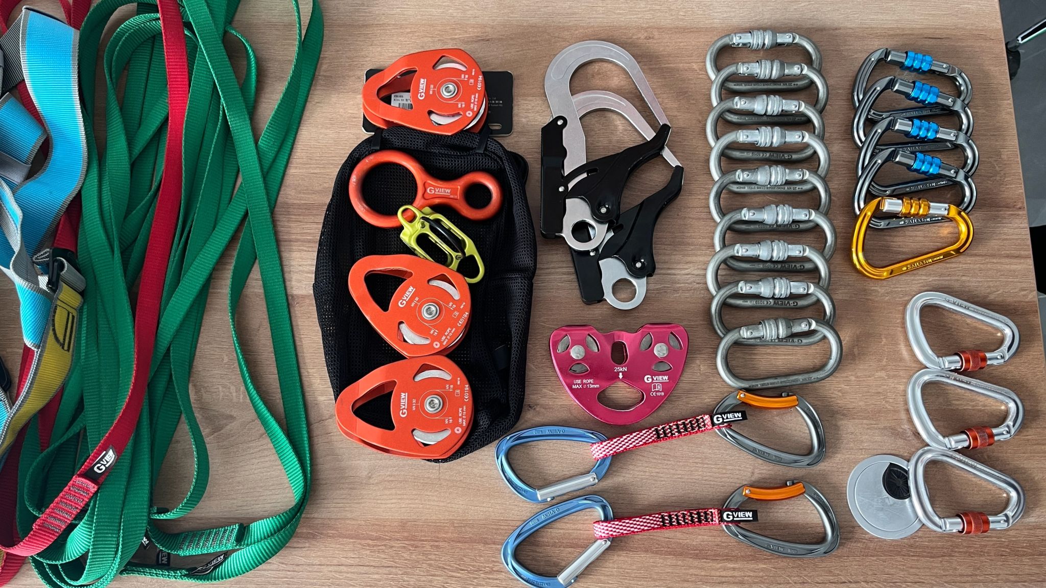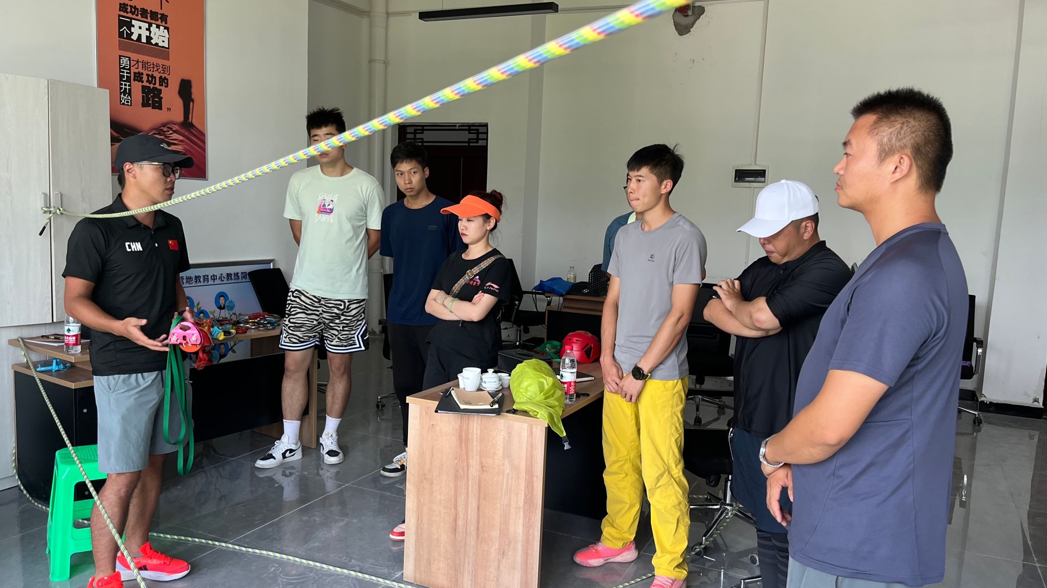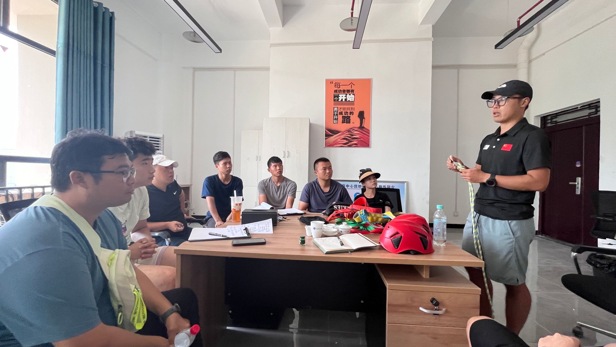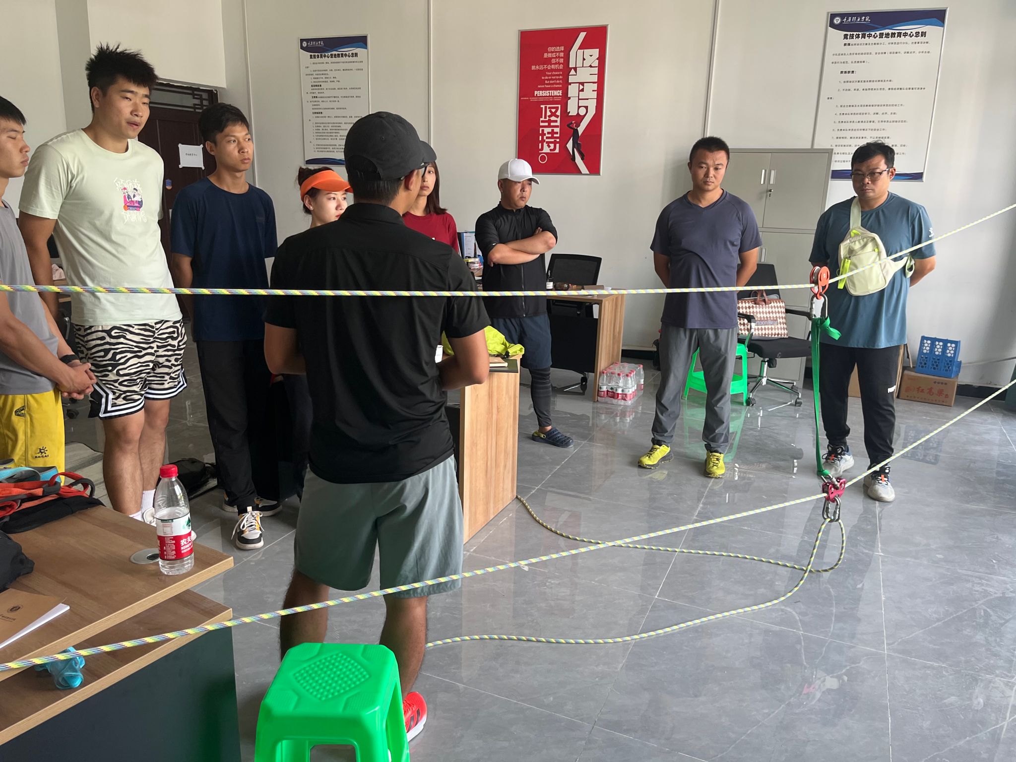 为高空项目开课后更好地开展,9月1日王碧铄主任安排段超教练为其余教练讲解高空装备及操作流程。只有足够地熟悉装备和操作流程,才能完成规范的操作,确保每一次课程的安全。段超教练先给大家介绍讲解的装备,例如8字环和ATC在做保护时两者的区别、如何确认绳子是否破损、O型锁和H型锁使用时的区别等,每一个装备的用途、系数、承重等都一一讲解。其后,结合目前高空基地的构建给大家演示模拟了三种建站方式,最后为大家讲解了高空项目的流程。