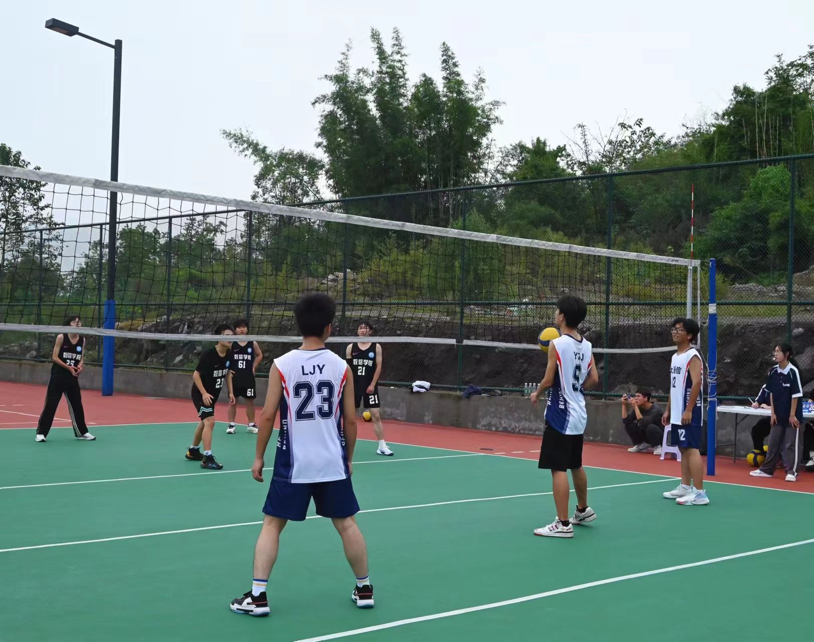 经过之前的排球比赛,队员们获得了更多的实战经验,在比赛开始前,高声呼喊必胜的口号,排球队内洋溢着灿烂的笑容。握手后,随着裁判的哨声比赛正式开始,以一颗精准无比发球,拉响了比赛的号角,球员们紧密配合、相互传递,随着比赛的进行,队员们反而更加沉稳,在网前博弈着、在中场防守着、在队伍间不断穿梭着,激烈而又迅猛,在一颗颗球的落地中奠定了胜利的基础。