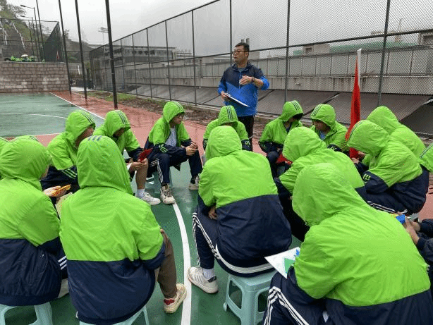 在蒙蒙细雨中同学们与各位教练初次相见,教练把三个班的同学们打散重新组建了6支队伍,然后各个小队在教练的带领下来到教室。首先,观看两段户外的视频,点燃了同学们对课程的期待和激情,接下来,教练详细介绍了营地教育的意义、概念和项目,让同学们了解之后三天的训练内容和方式。介绍完之后教练要求各个小队选出两名队长并讨论出小队名、队歌、队徽和队形。在这个过程中,同学们积极发言、提供有意思的想法,现场的创作氛围好不欢乐,拉近了同学们之间的距离,也为培养同学们的团队协作能力和集体责任感奠定基础。