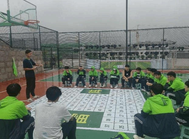 课程第二天,各小队分配了各自的教练,在教练的带领下进行营地教育的各种项目训练,虽然天空中还在下着小雨但是丝毫抵不住同学们的热情。2队首先进行了七巧板的团队考验,同学们被教练员随机分组,在规定时间内,所有人员需要一直待在固定位置,按照要求完成相应任务,各组每完成一项任务需举手向教练示意,教练检查确认后将为正确的小组加相应的积分。各组队友相互协作,遇到困难积极沟通,用理智与冷静攻破一道又一道难关。本次项目培养同学们团队沟通的意识,体验到及时与队友进行有效的沟通,会让我们少走弯路,达到事半功倍的效果,在活动之后老师更是在雨中为大家讲解这个项目的关键——沟通!