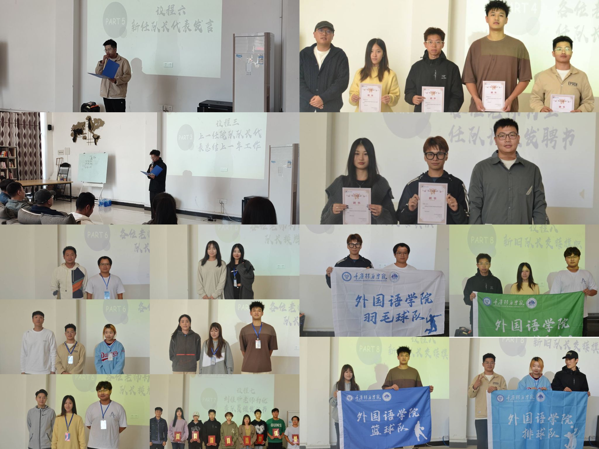 新学期,新鲜血液。在不断传承的基础上,不断引入新生活力,是院队历久弥新的关键。外国语学院体育协会于2023年10月20日召开了外国语学院院队交接仪式暨第六届院队成立大会。本次大会,很荣幸邀请到了校足球教练罗诗艺老师、校篮球教练曾佳老师、校排球教练李泉锋老师、校啦啦操教练王尚傲老师、校铁人三项教练黄静老师、外国语学院副院长马喆老师、外国语学院团总支书记吕戈老师以及外国语学院竞技体育板块指导老师阳果老师前来参加。