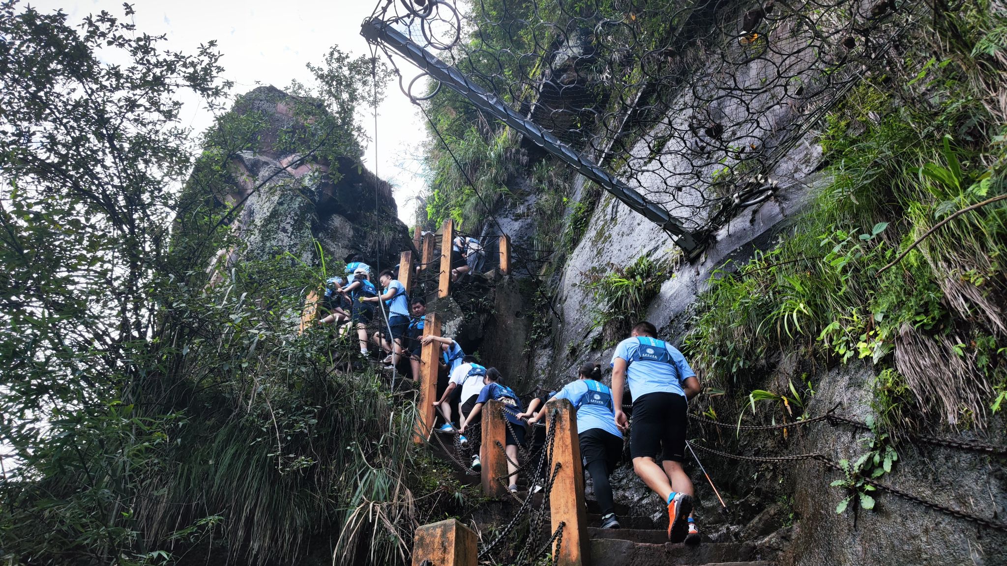 山势陡峭险峻,沿山而行。在这段路上奔跑,需要付出更多的努力和耐心,随处突出的石岩需要弯腰低头,狭窄的道路上不能竞相奔跑的同时还要注意脚下湿滑的山路,道路的陡峭亦能体现出越野赛的挑战性。为了呈现更好的拍摄效果,同学们尽力奔跑,努力跑过这一段坎坷,登顶云端,与雄伟壮观的老瀛如来一起平视,共赏老瀛如来,体验越野赛带来的情趣。