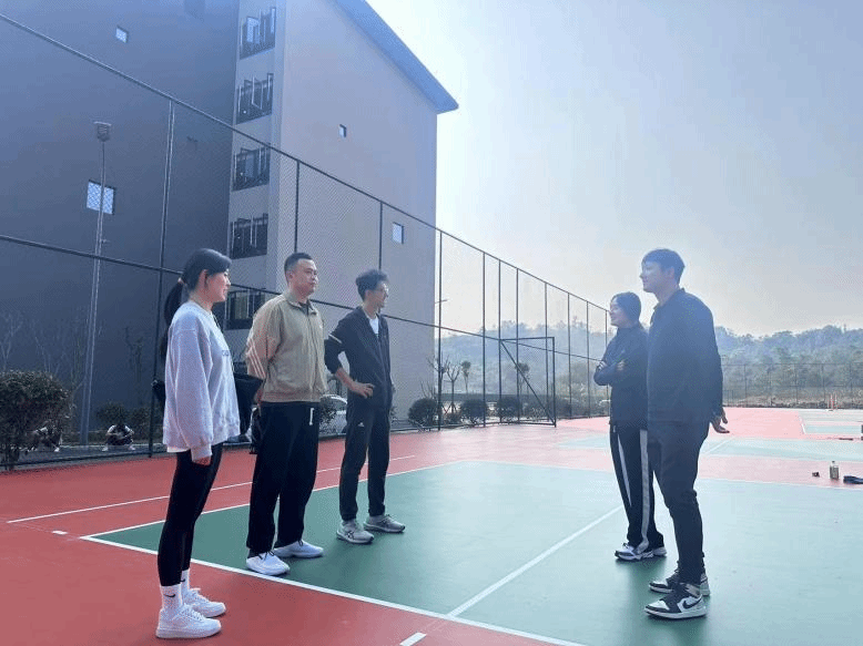 五位教练先是一同参观了綦江校区古剑书院一旁新建的排球场地,五位教练在新球场上交流学习,同时也对新的训练场地赞不绝口。新建的排球场整洁干净,虽尚未正式投入使用但相信不久的将来排球队的队员便会在这番新天地飘洒汗水,不断地提升自己。除此之外,期待新的场地能更加激励成员们努力训练,刻苦提升自己。相信新的场地也会带来新的机遇及挑战。为成员们的进步贡献力量。