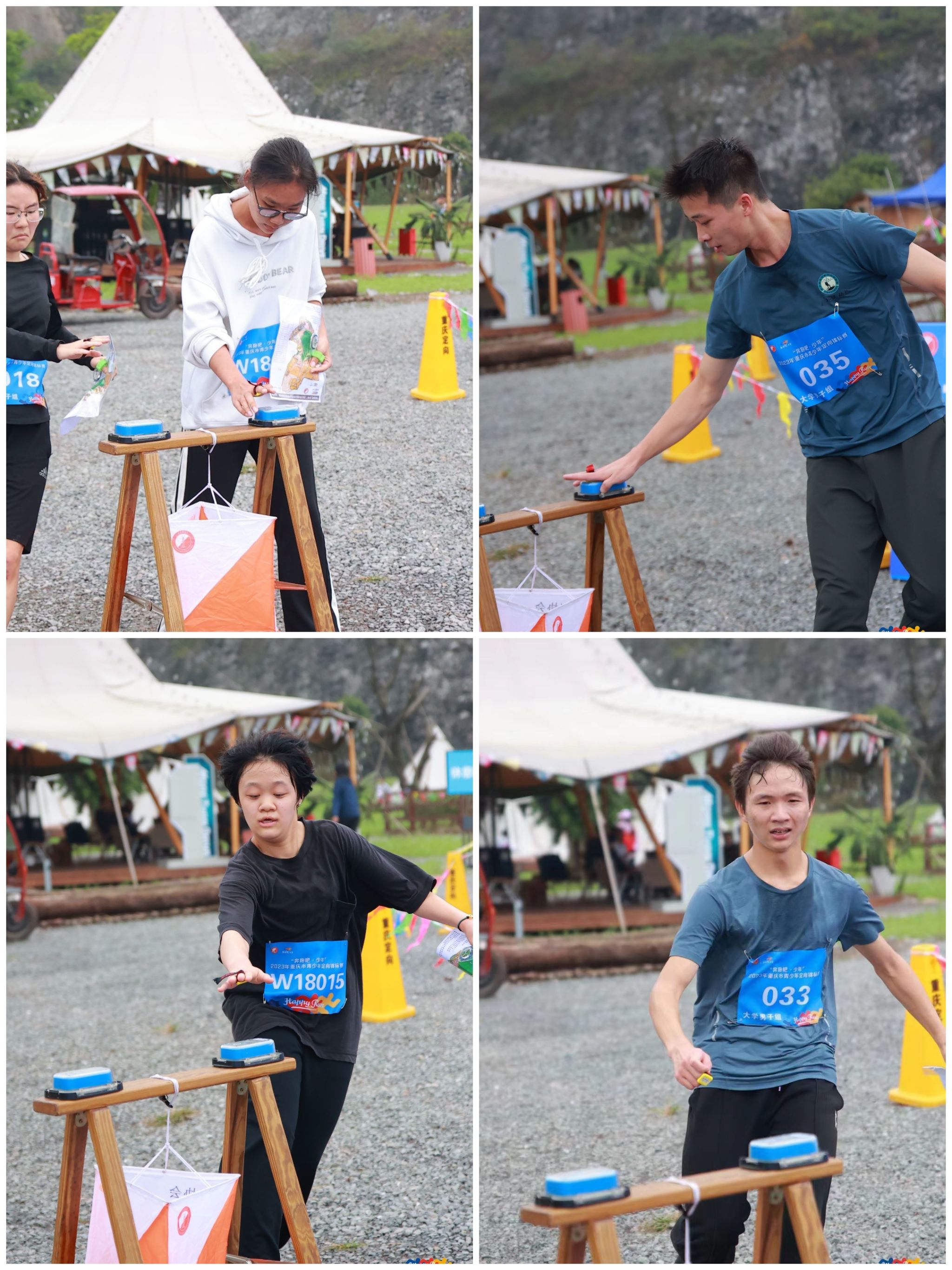 教练们再三强调起跑前一定要打清除点签器,到终点时记得打100号点和终点,反复提醒不要漏打、错打以确保成绩的有效性。经验丰富的队员为大一的新队友分享经验,带领新队员了解锦标赛的规则和一些“赛中小技巧”。队员们相互加油打气,为队友的精彩时刻呐喊、欢呼着,团队的集体荣誉感将校户外运动队队员们紧紧抱成一团,朝着同一个目标共同奋斗。领好号码布和指卡后,队员们搭好帐篷放好背包,自行热身。随着开幕式的结束,裁判准备就绪,运动员也在待发区就位。