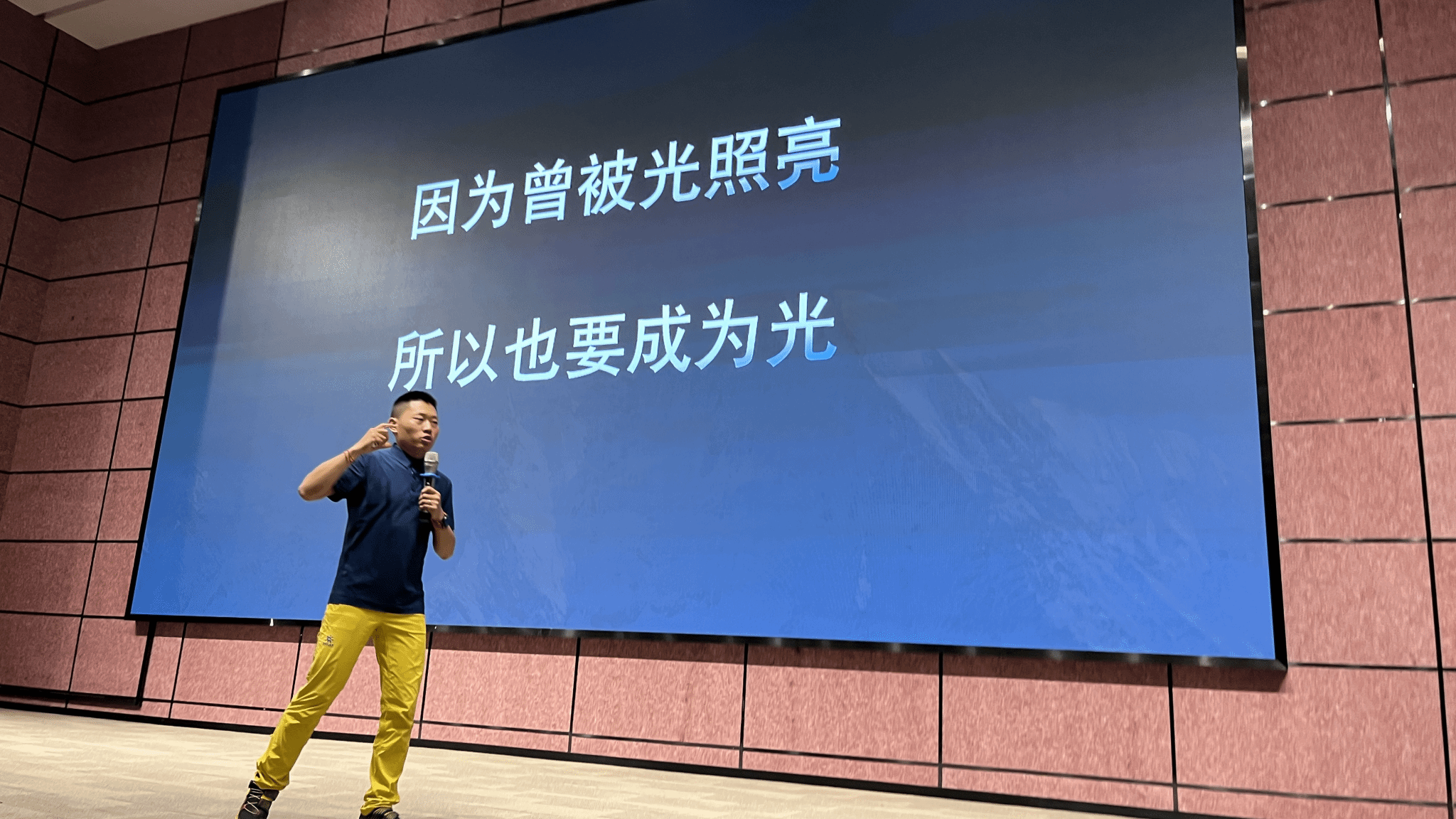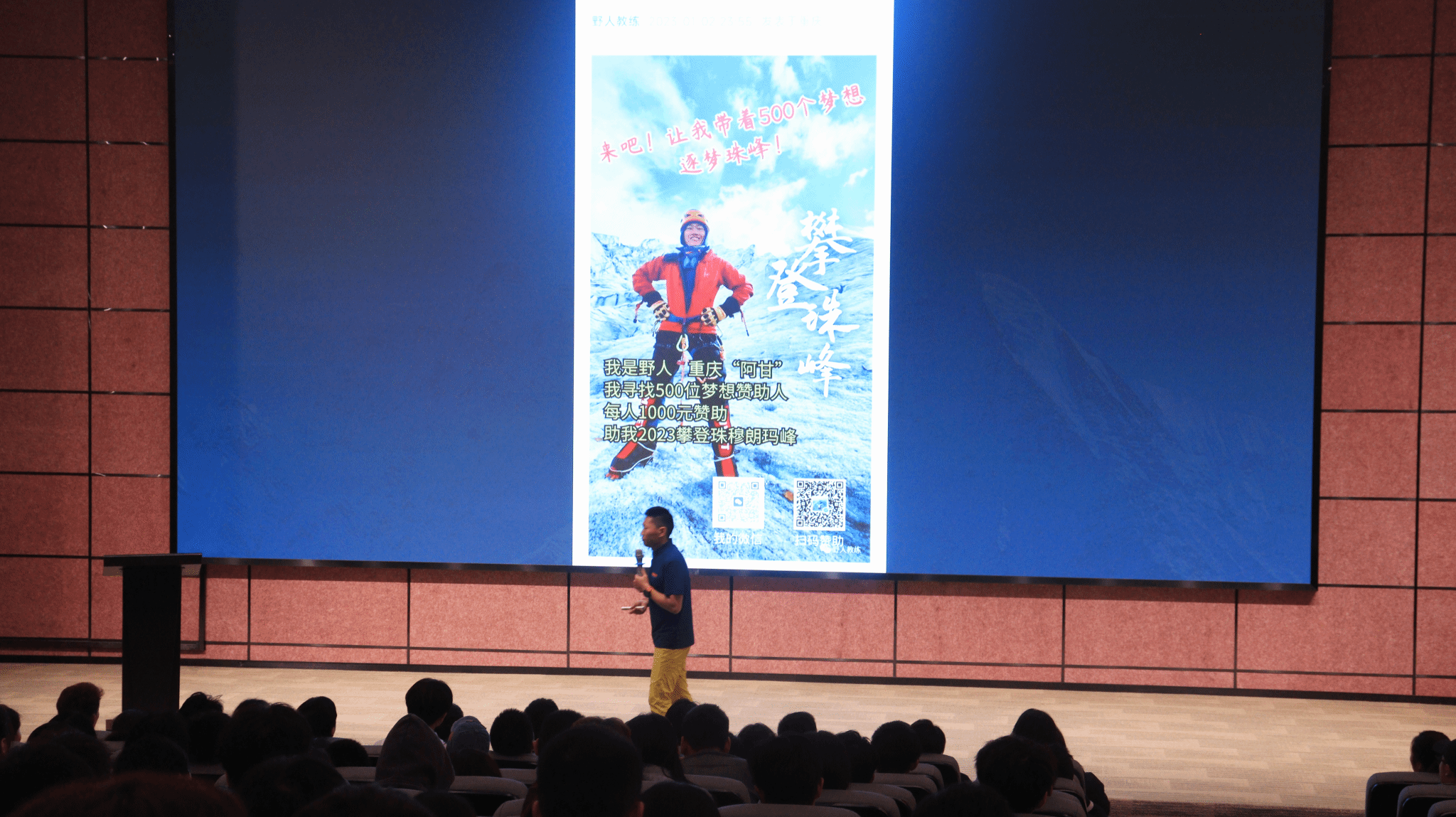2022年12月31,野人教练向他的第四个梦想——珠穆朗玛峰发起总攻。他向有梦想人申请资助,很荣幸我校户外运动队成为第258位助梦人。最后,他带着506个梦想在2023年5月18日9点42分成功登顶海拔8848.86m的珠穆朗玛峰。登峰对于正常人来说不是一件容易的事,更何况全身伤痛、脊柱不能弯曲、活动受限的他?但为了自己的梦想,他突破艰难险阻,撑到最后,坚强的意志力无一不让在场聆听的学生为之震撼。