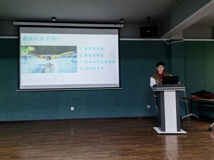 活动开始,王钰涵教练先为大家播放了一段我国运动员汪顺在比赛中的混合泳视频,并结合视频内容介绍了蛙泳、自由泳、蝶泳、仰泳四大泳姿,以帮助不熟悉泳姿的同学们对游泳进行初步的了解。接下来,教练以近期火爆的院线电影《热辣滚烫》为引入,带大家走进游泳,走进校㵘淼女子游泳队。通过王钰涵教练的讲解,同学们了解到校女子游泳队的团队荣誉和建队精神,也认识到在队内的日常生活不只有水下训练,还有特色团建活动以及游泳理论学习。优秀队员的丰富履历和学姐队长们的寄语让新同学们倍感鼓舞,感受到学校对竞技体育的重视和鼓励。