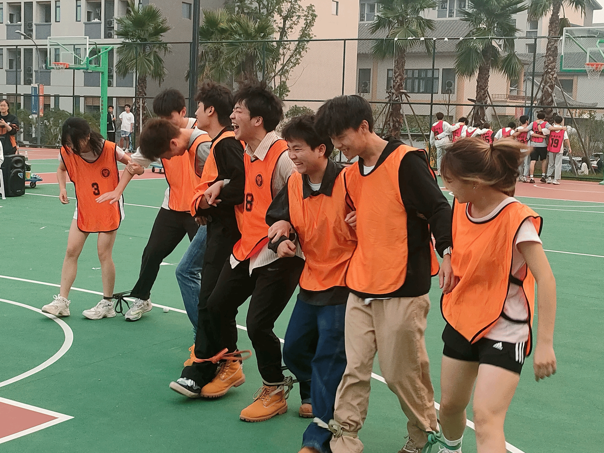 运乒乒游戏中,队员们虽遭遇乒乓球易掉落的难题,但在队友鼓励下坚持不懈。两人三足游戏里,部分队伍配合默契快速冲线,有的虽遇状况仍坚持调整前行。双人背夹运球环节,队员们紧密配合、谨慎移动,时刻留意球的位置,一旦球有松动迹象就立刻调整姿势,保障运球稳定。