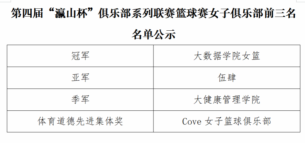 根据《完满教育委员会竞技体育学年重点工作计划》,竞技体育中心于2024年12月9日起在瀛溪书院篮球场举办的第四届“瀛山杯”俱乐部系列联赛女子篮球赛现已完满收官,现将本次比赛的女子俱乐部的前三名进行公示。名单如下。