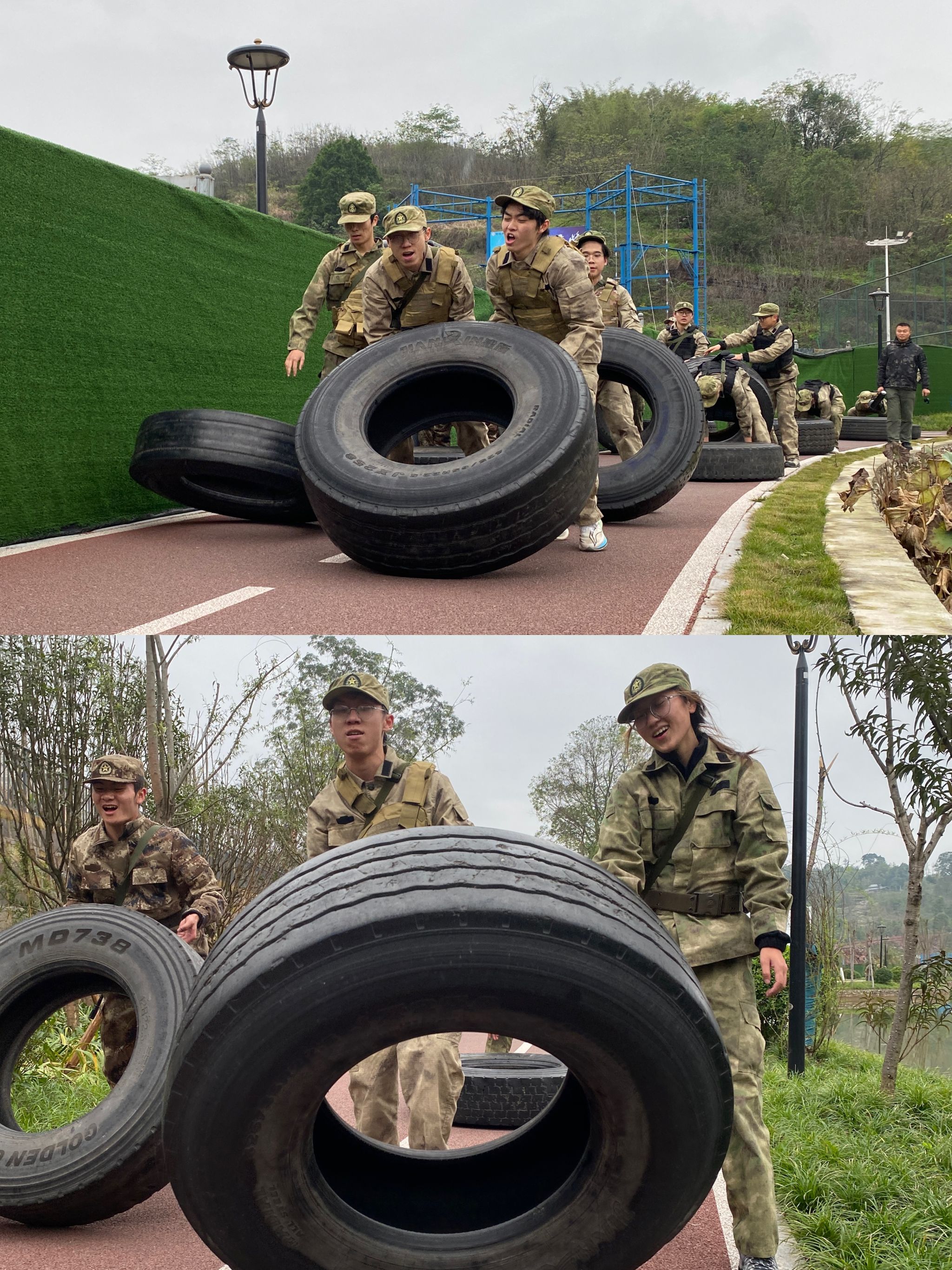 团队圣塔、轮胎战争和队列训练项目更是对团队执行力、沟通能力和意志力的全面考验。在团队圣塔项目中,队员们集思广益、分工有序,从手忙脚乱到井然有序,团队意识在队员心中悄然发生变化。轮胎战争中,队员们面对巨大的挖掘机轮胎,没有退缩,而是战意昂扬,分工协作,齐心协力地推动轮胎,每一次的用力都伴随着响亮的口号声,将肌肉上的酸痛转化为无穷的意志力。队列训练中,每一次整齐划一的动作都凝结着团队凝聚力和战斗力。