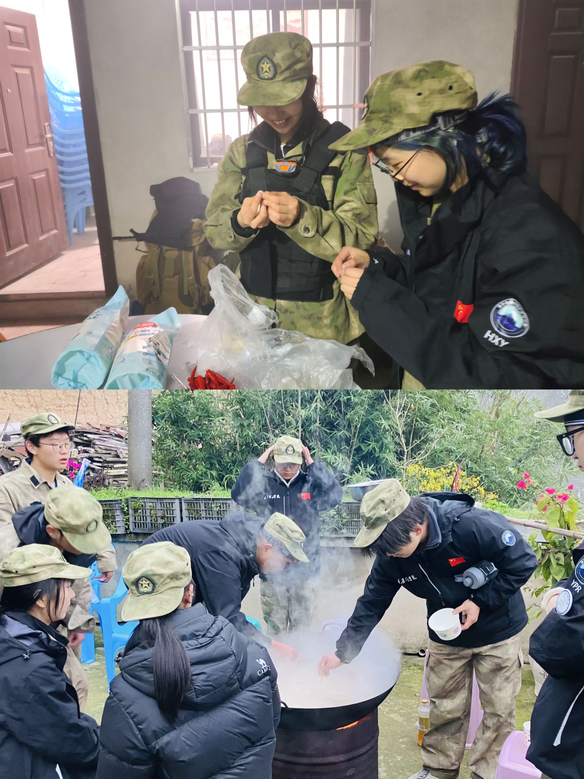 夜幕低垂,户外运动队的33名队员抵达营地——千秋村村委会,在这里迎接他们的是一项特别的挑战:搭建营地和筹备这顿近40人的晚餐。炊烟袅袅中,大家迅速分工,从搭帐篷、洗菜、切菜到生火煮饭,每个环节都井然有序,团队协作的默契在忙碌中显露无遗。欢声笑语交织其间,为这场自力更生的晚餐增添了几分温馨与乐趣。当队员们围坐一圈,共享着自己亲手烹制的美味佳肴时,每个人的心中都洋溢着满满的成就感与团队的温暖。