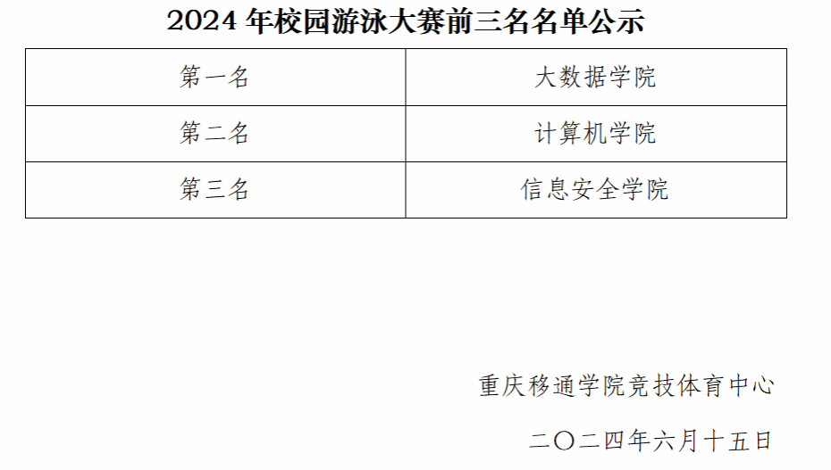 根据《完满教育委员会竞技体育学年重点工作计划》,竞技体育中心于2024年6月15日起在星池·游泳馆举办的2024年校园游泳大赛现已完满收官,现将本次比赛的前三名进行公示。名单如下: