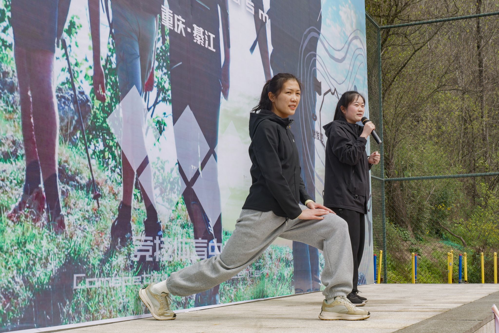 活动当日,参与师生于古剑排球场有序集结。营地教育中心张桃老师率先开展行前指导,通过互动式讲解对徒步路线规划、野外应急措施及环保规范进行细致说明。在体育教学部潘元晨、刘文玲两位专业教师的带领下,全体参与者完成了涵盖拉伸、关节激活等基础动作的科学热身。随着发令声响,队伍沿老瀛山麓开启征程,途经翁家嘴、老林岗、肖家冲、长五间及下坝湾等标志性路段,形成一道跃动的户外风景线。