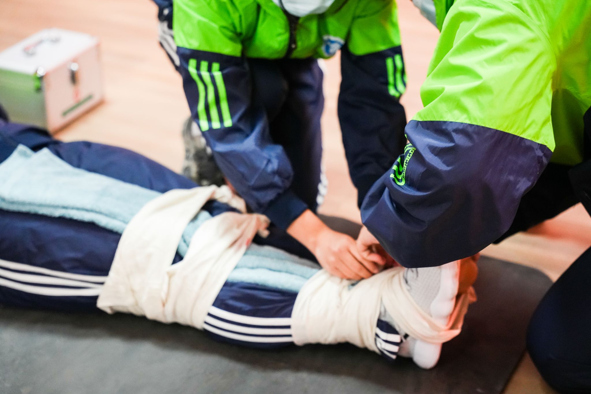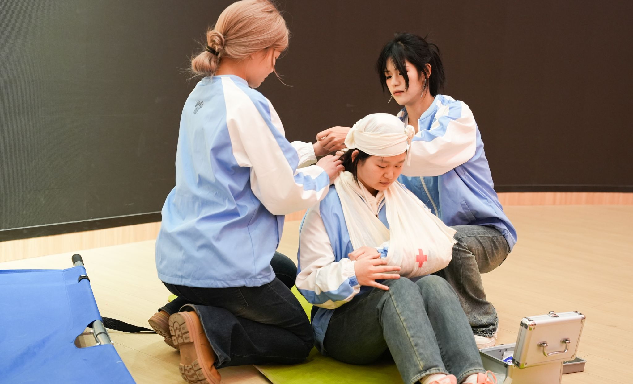 本次大赛以“人人学急救、急救为人人”为主题,设置“安全技能竞赛”与“应急救护知识竞赛”两大环节,涵盖心肺复苏(双人操作)、右下肢闭合性骨折固定(双人协作)、车祸现场救援情景模拟、应急救护知识笔试四大项目。竞赛全程模拟真实救援场景,要求选手在限定时间内完成规范操作,并由专业裁判组依据操作流程、动作规范及人文关怀等维度进行评分。其中,心肺复苏项目采用半身假人模型与AED训练机,严格对标国际急救标准;创伤救护环节首次引入真人模拟伤员,考验选手的现场应变能力;知识竞赛则以题库为基础,涵盖红十字运动历史、急救原则、灾害应对等理论内容,全面考察学生的综合素养。