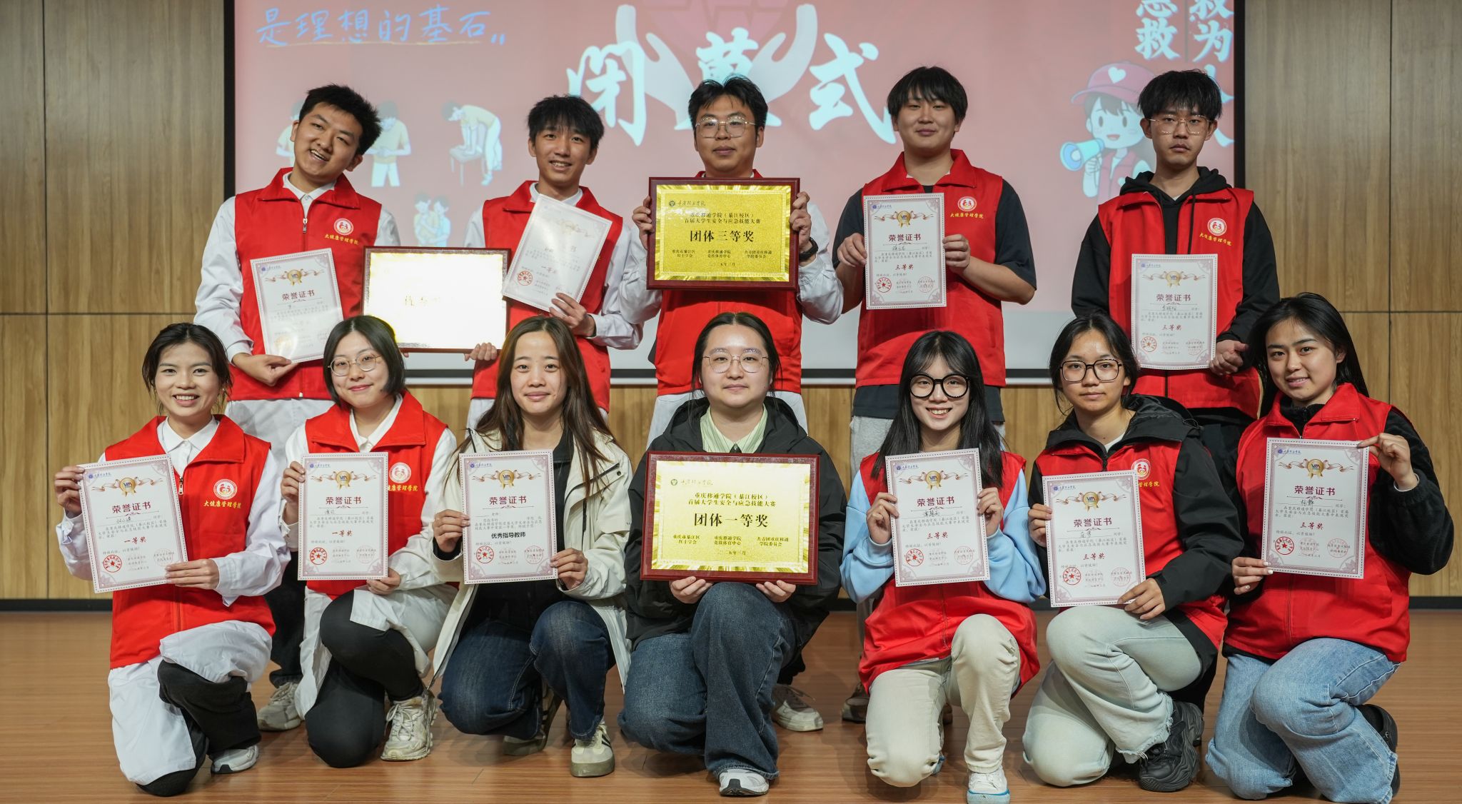 此次大赛吸引了全校16支队伍踊跃参与,各参赛队由5名学生(含1名异性)及1名指导老师组成,在赛场上展开了激烈角逐。最终,大健康管理学院2队凭借精湛的操作技能与扎实的理论知识脱颖而出,荣获团体一等奖,另有多支队伍分获二、三等奖以及“优秀组织奖”“道德风尚奖”等荣誉,6名指导老师也因出色的指导工作获评“优秀指导教师”。綦江区红十字会代表表示:“大赛不仅是学生急救技能的试炼场,更是培育社会责任感与团队协作精神的摇篮,期待更多学生投身急救志愿服务,为构建安全校园与和谐社会贡献力量。”参赛学生代表感言:“通过备赛,我们深刻体会到急救技能的重要性。今后将积极传播所学知识,让‘生命守护者’的队伍不断壮大。”
