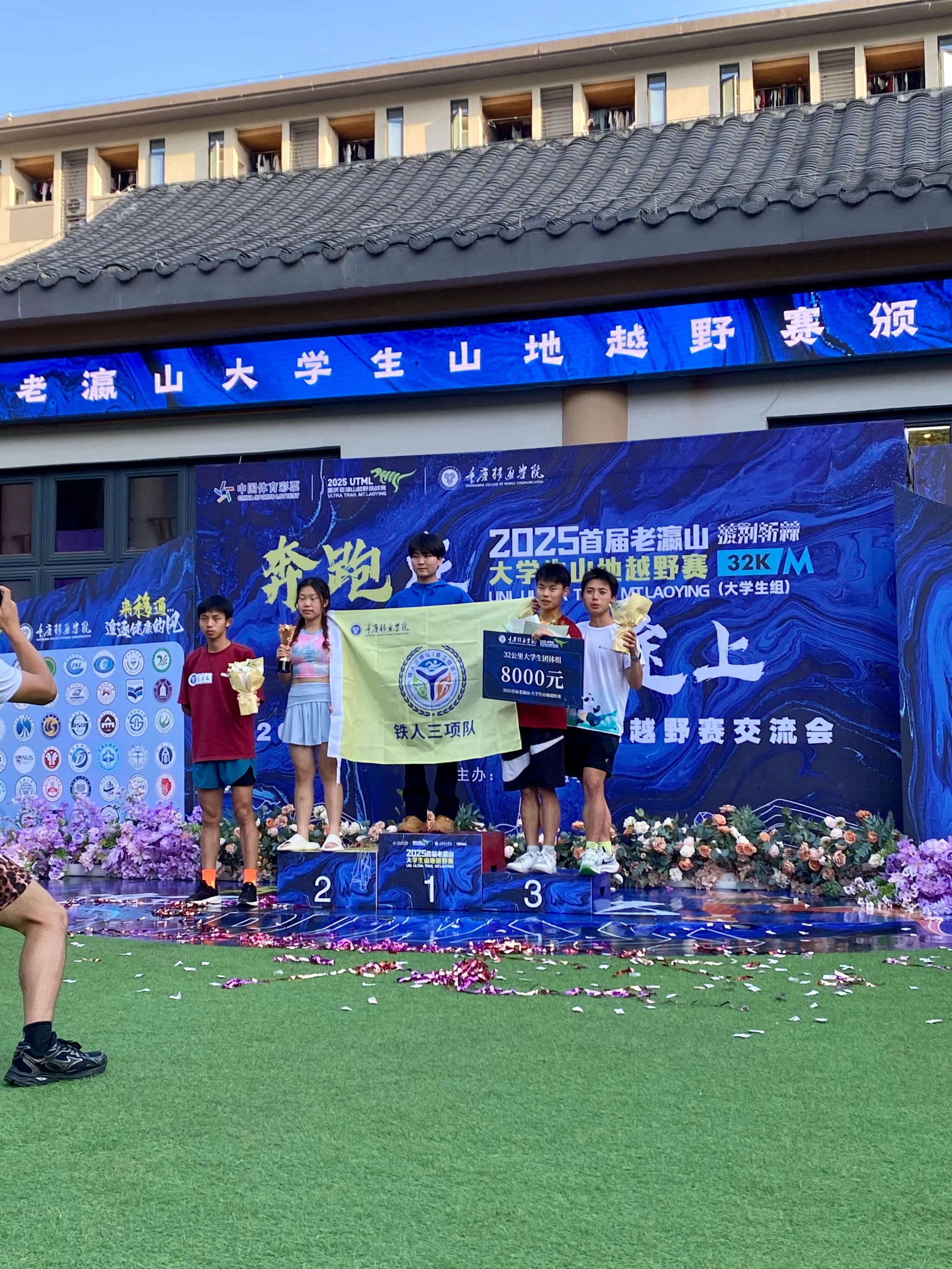 5月11日上午7:30,2025第四届重庆老瀛山越野挑战赛暨老瀛山大学生山地越野赛在綦江校区鸣枪开跑。“首届全国老瀛山大学生山地越野赛”由重庆移通学院承办,比赛吸引了全国56所院校280名选手报名参赛,涵盖个人赛与团体赛两大组别,总奖金池超10万元——我校铁人三项代表队派出18名队员,分两队出战。经过教练组的细心指导,队员们的刻苦训练,铁人三项队分别获得了32KM团体组第三名和第七名的优异佳绩,展示了铁人三项队的奋勇拼搏,众志成城的铁人精神。