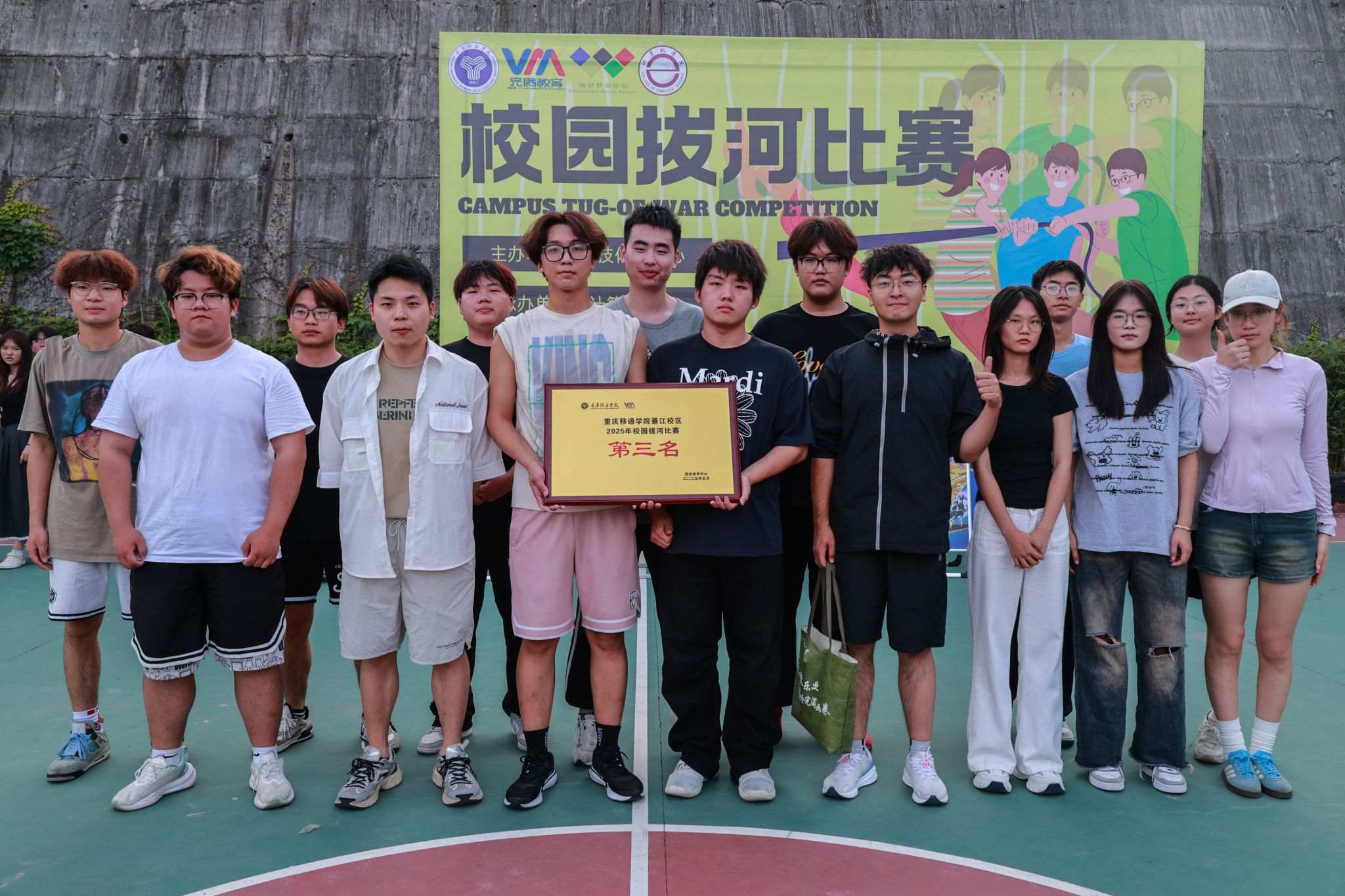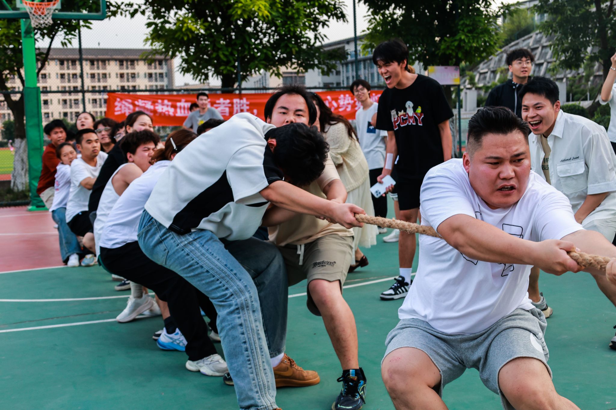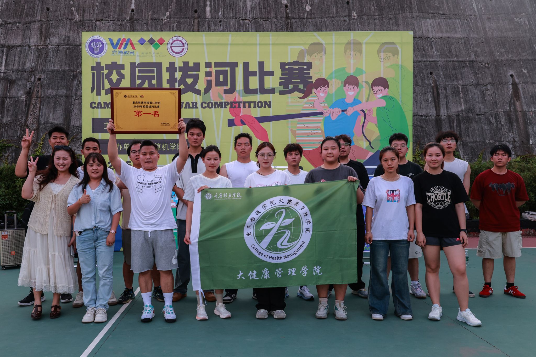 2025年5月21日,由竞技体育中心主办,计算机学院承办的2025年校园拔河比赛决赛在篮球场拉开帷幕!在初赛阶段,通信与信息工程学院、大数据学院、大健康管理学院和信息安全学院这四支实力超群的队伍,一路过关斩将,成功突围而出。今日,他们齐聚于此,即将上演一场巅峰对决。每支队伍都摩拳擦掌,将凭借强大的力量与紧密无间的团队协作,向着象征至高荣誉的冠军宝座发起冲击!让我们一同拭目以待,见证这场精彩赛事的冠军诞生!