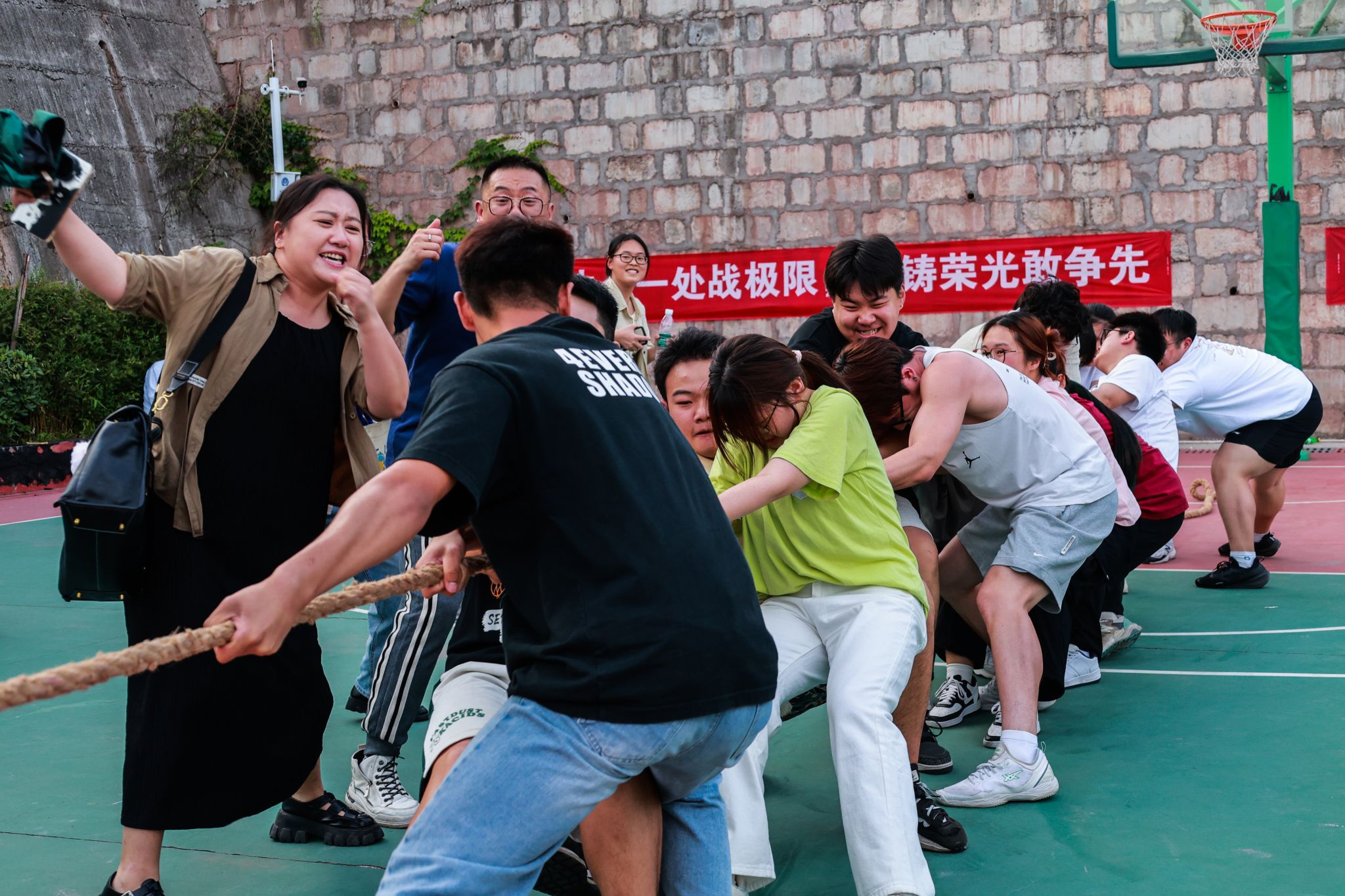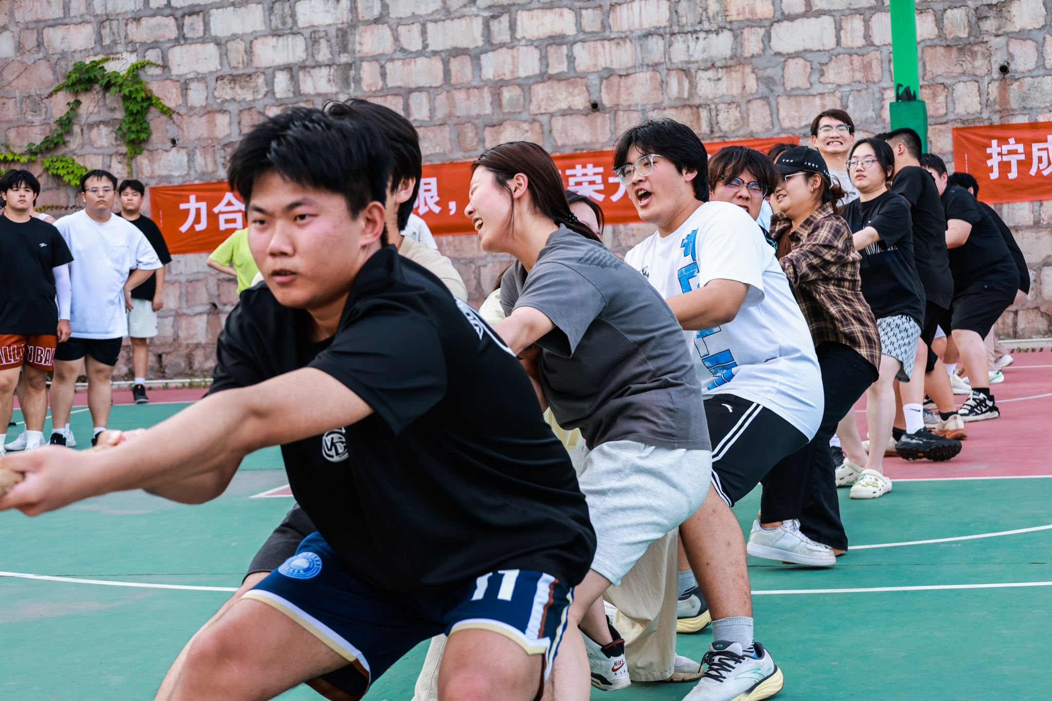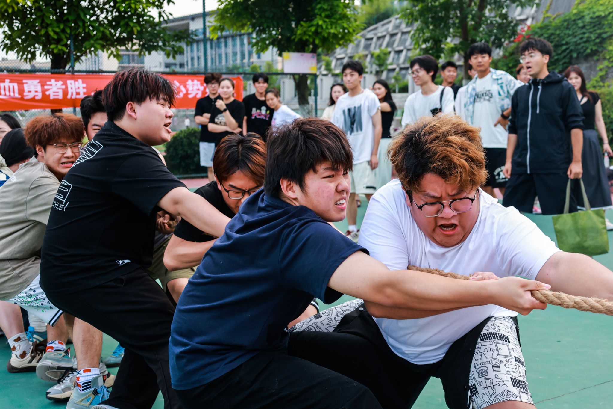 2025年5月21日,由竞技体育中心主办,计算机学院承办的2025年校园拔河比赛决赛在篮球场拉开帷幕!在初赛阶段,通信与信息工程学院、大数据学院、大健康管理学院和信息安全学院这四支实力超群的队伍,一路过关斩将,成功突围而出。今日,他们齐聚于此,即将上演一场巅峰对决。每支队伍都摩拳擦掌,将凭借强大的力量与紧密无间的团队协作,向着象征至高荣誉的冠军宝座发起冲击!让我们一同拭目以待,见证这场精彩赛事的冠军诞生!