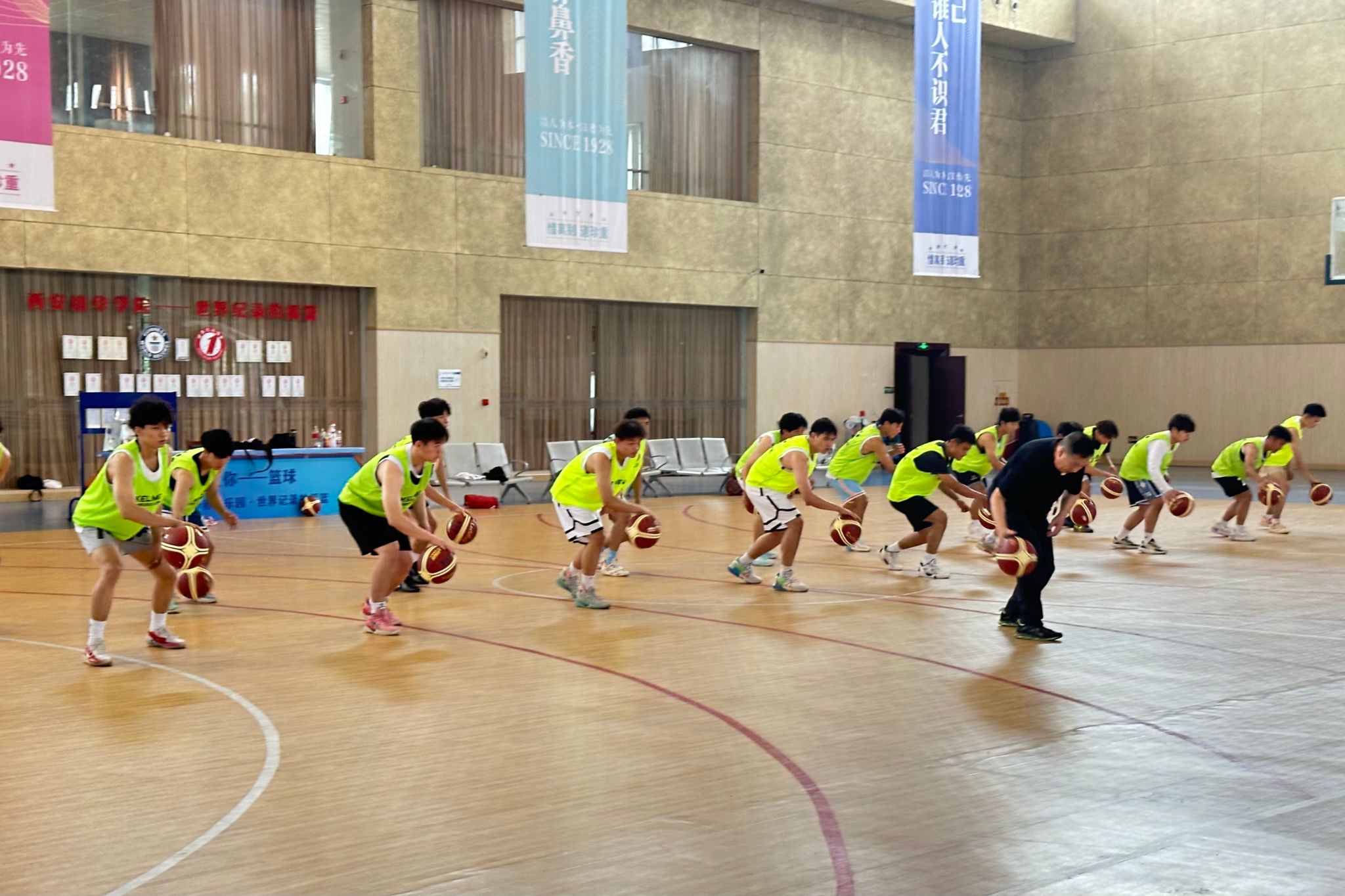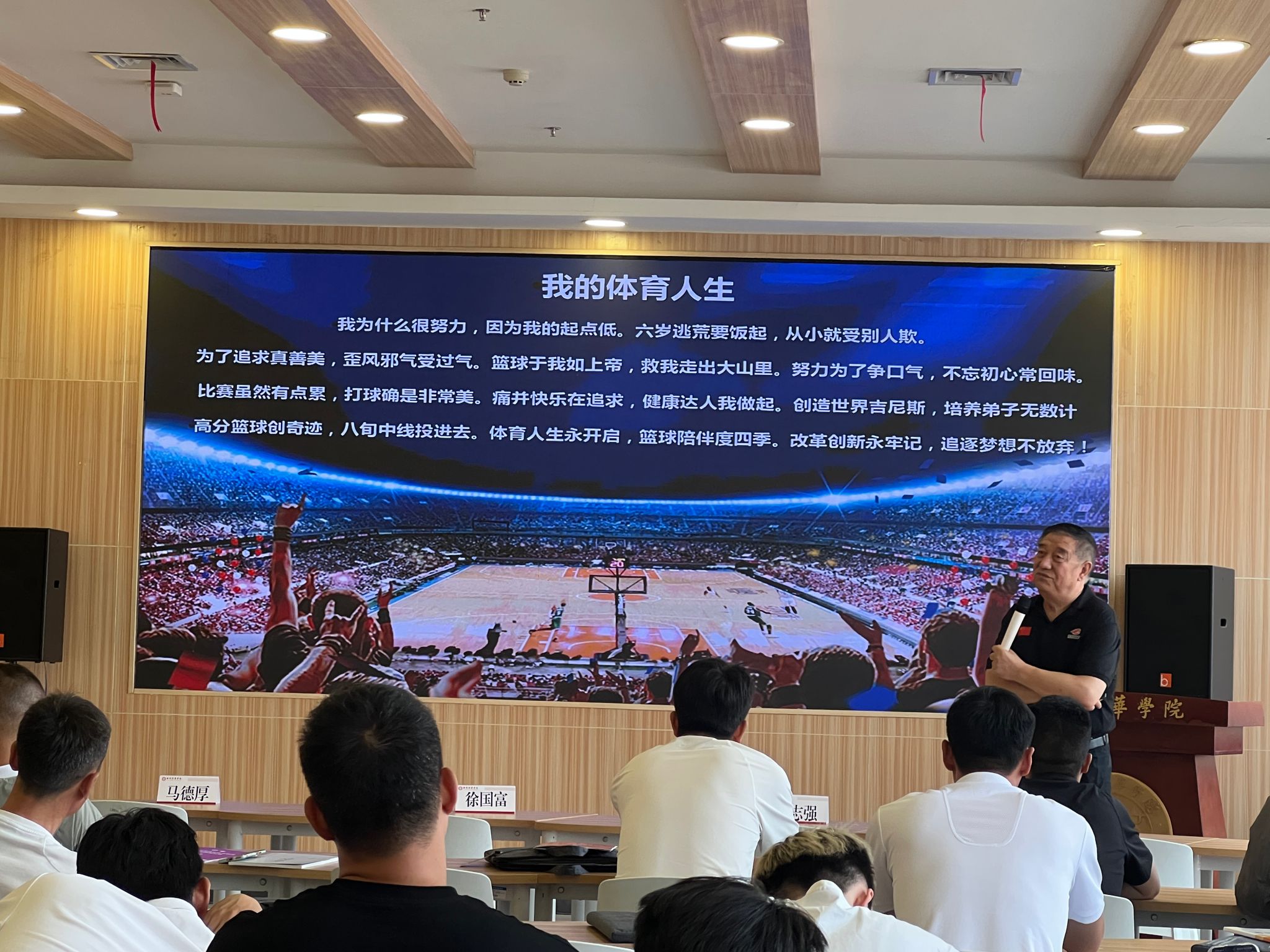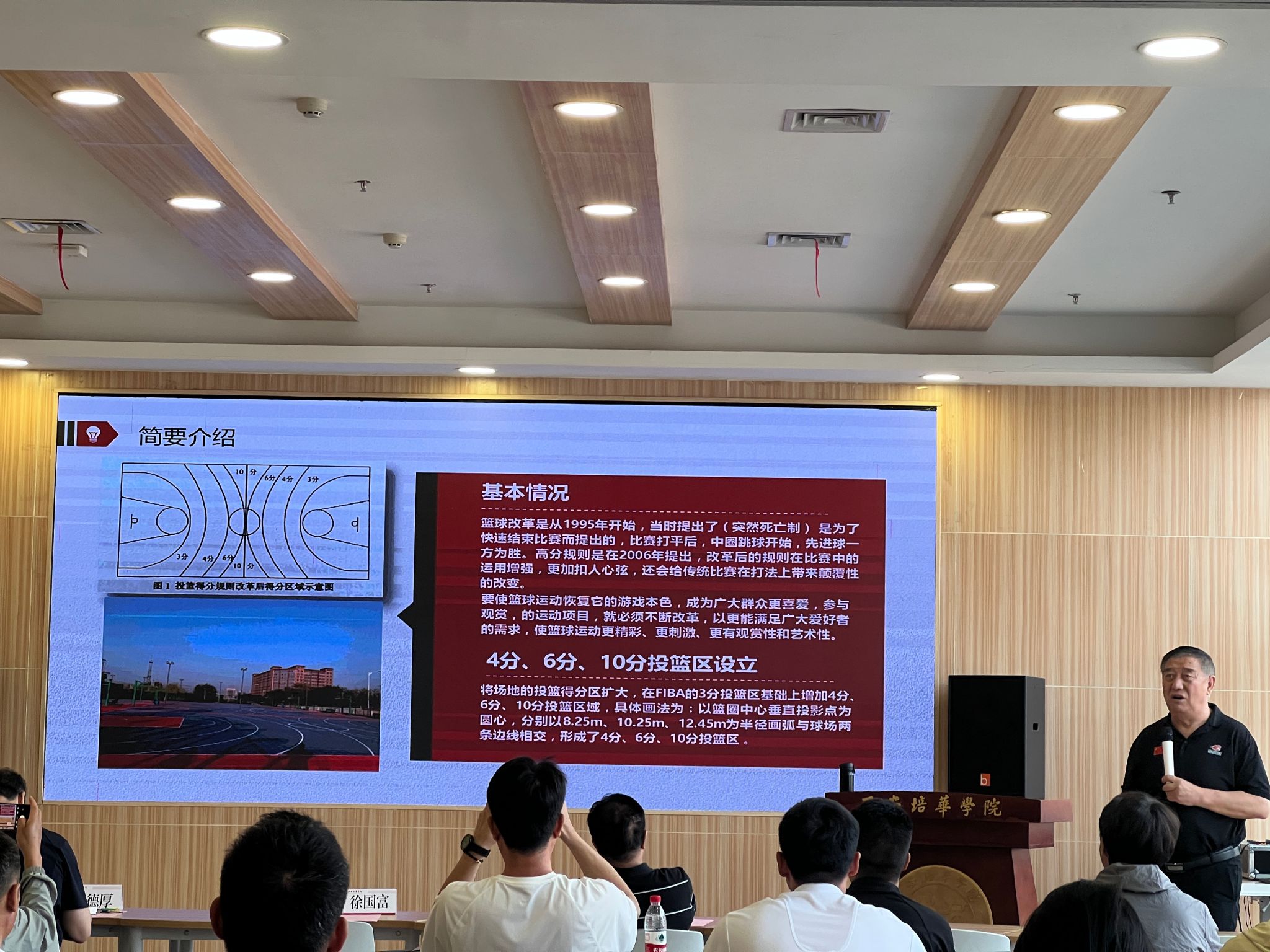 徐国富教授在篮球实践教学中,针对运球技术、23进攻战术进行示范指导,并提出“4分、5分、8分、10分球”创新评分设想。次日,他围绕《校园篮球改革创新》主题,分享“小场地大创新”案例,通过三人制规则优化、身高分级赛制等举措,推动篮球教学普及化、公平化发展。