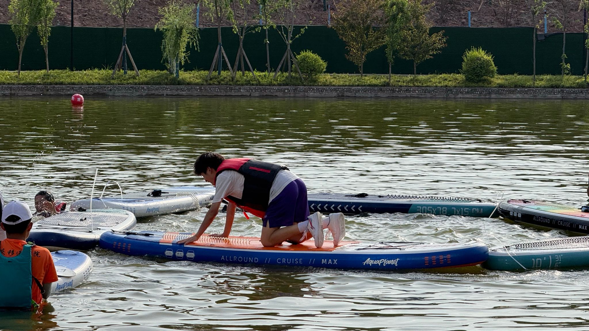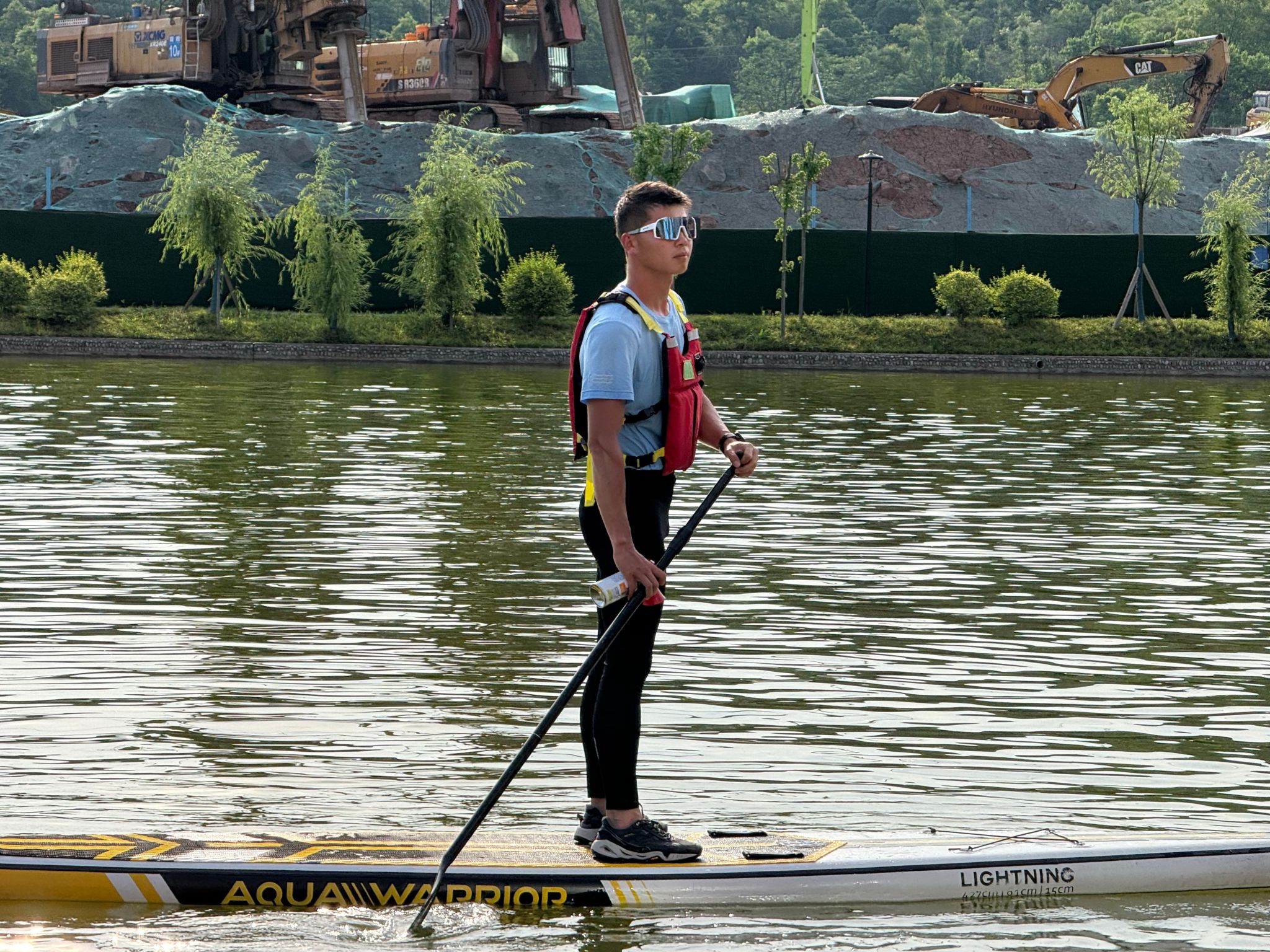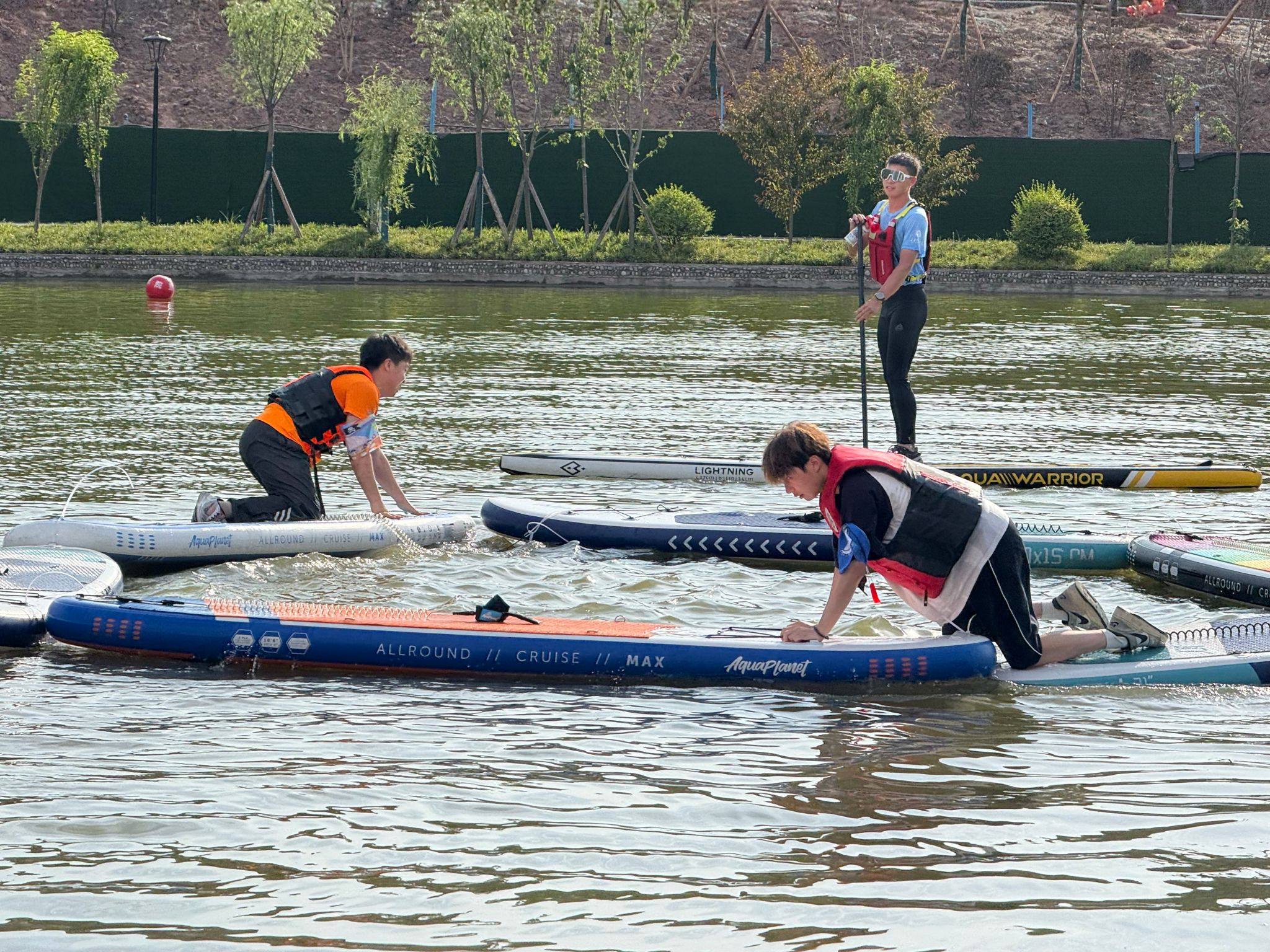 "激流追逐"双人竞速:双人桨板逆时针竞速环节中,选手需在保持速度的同时精准操控方向,赛道间紧张刺激的追逐引发阵阵喝彩。