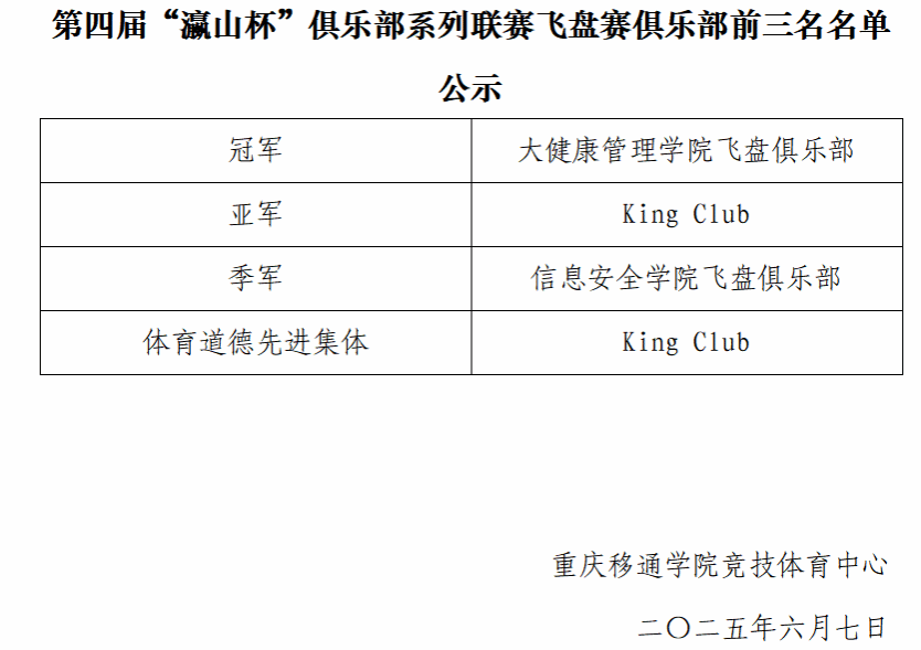 根据《完满教育委员会竞技体育学年重点工作计划》,竞技体育中心于2025年6月6日在校运动场举办的第四届“瀛山杯”俱乐部系列联赛飞盘赛现已完满收官,现将本次比赛的俱乐部的前三名进行公示。名单如下。