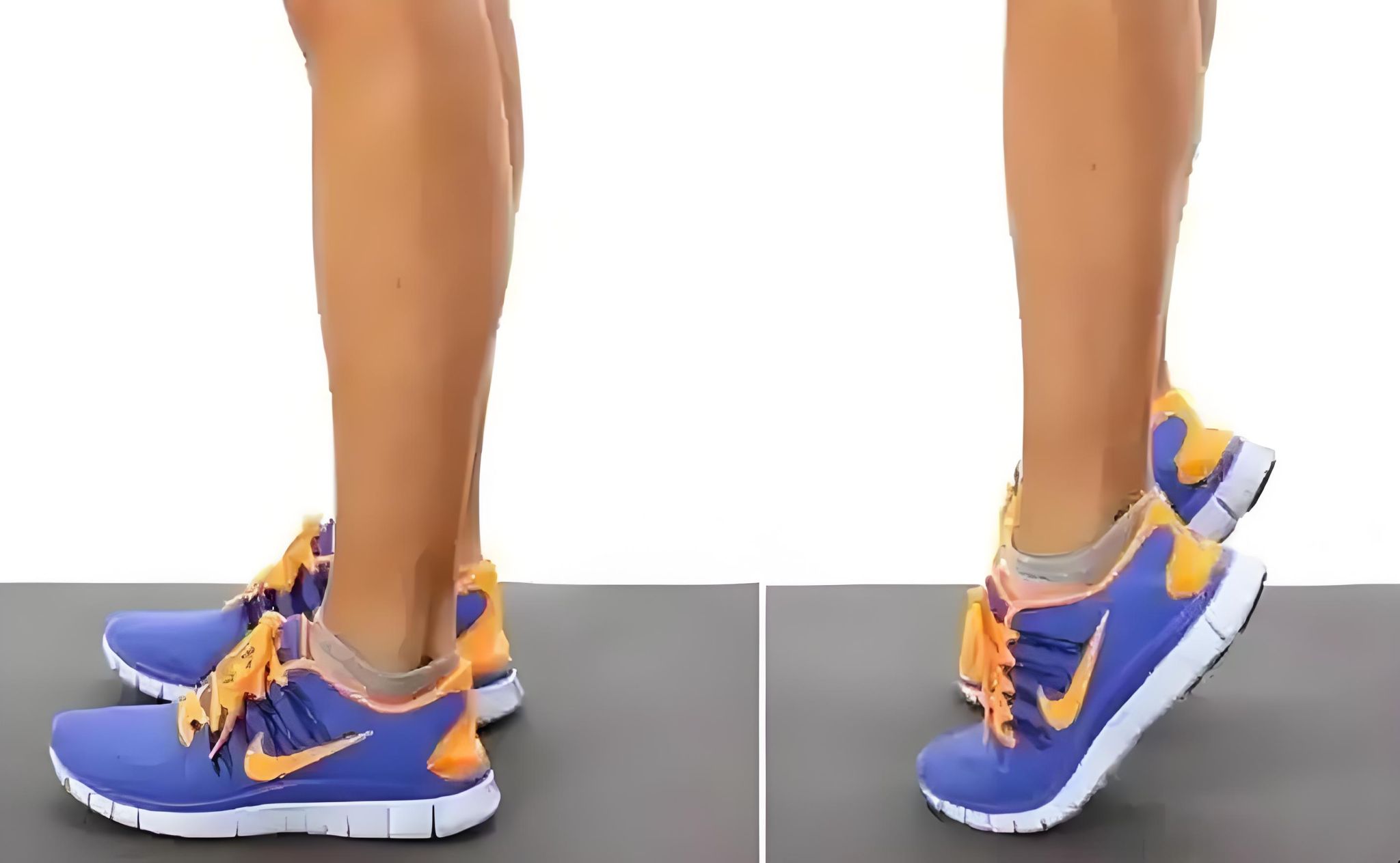 提踵练习:脚尖站立,包括足尖向前,保持最高点3秒后缓慢落下。每组15-20次,做4-6组。